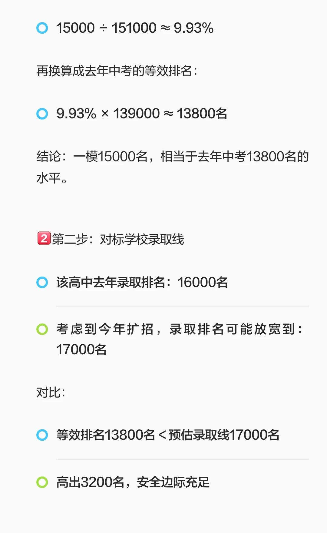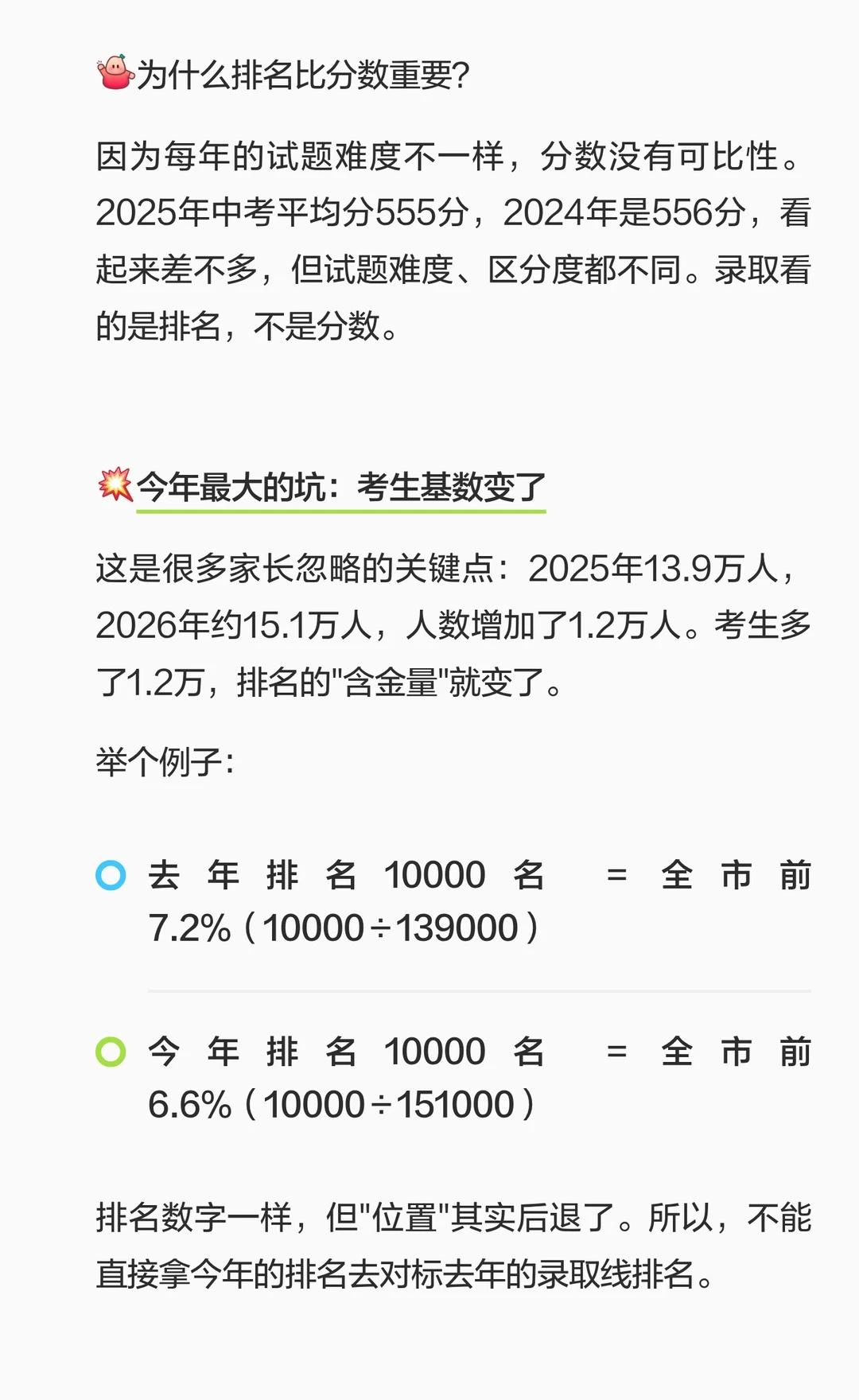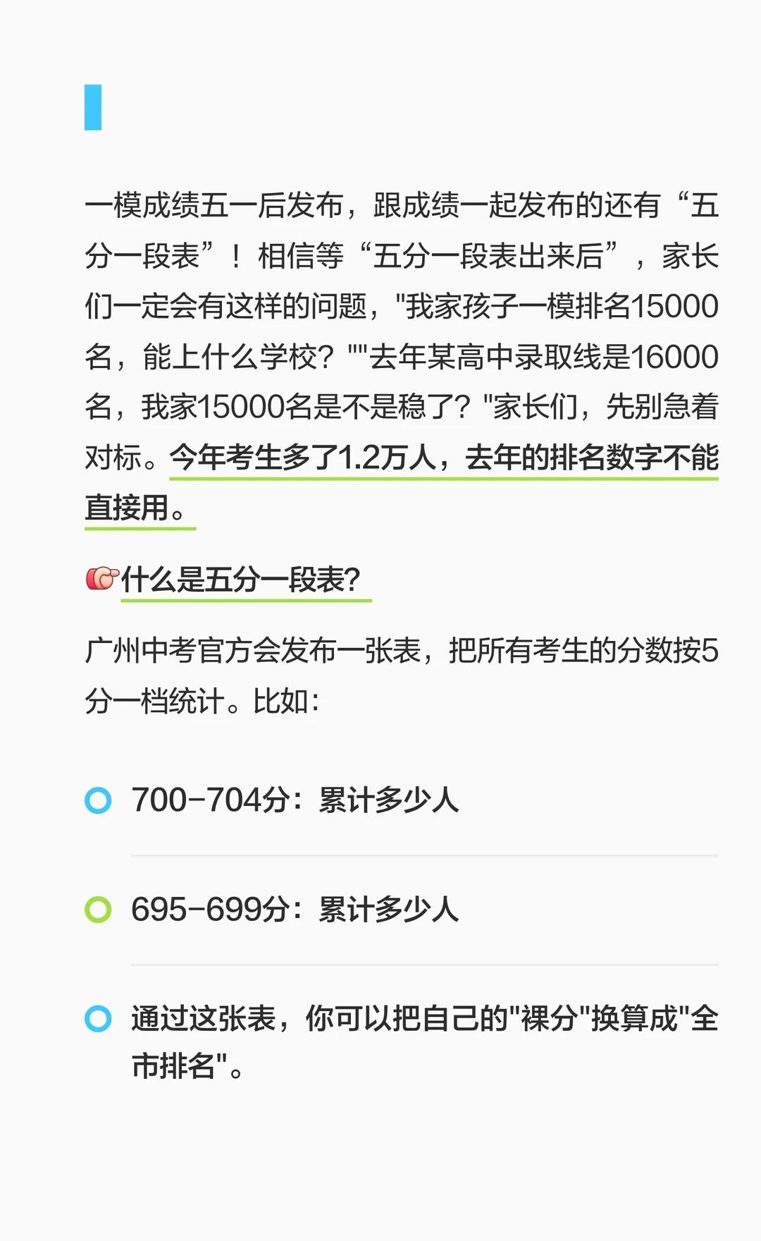 一模成绩五一后发布,跟成绩一起发布的还有“五分一段表”!相信等“五分一段表出来后”,家长们一定会有这样的问题,"我家孩子一模排名15000名,能上什么学校?""去年某高中录取线是16000名,我家15000名是不是稳了?"家长们,先别急着对标。今年考生多了1.2万人,去年的排名数字不能直接用。