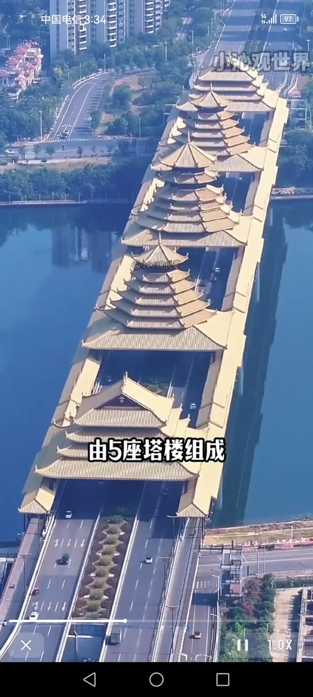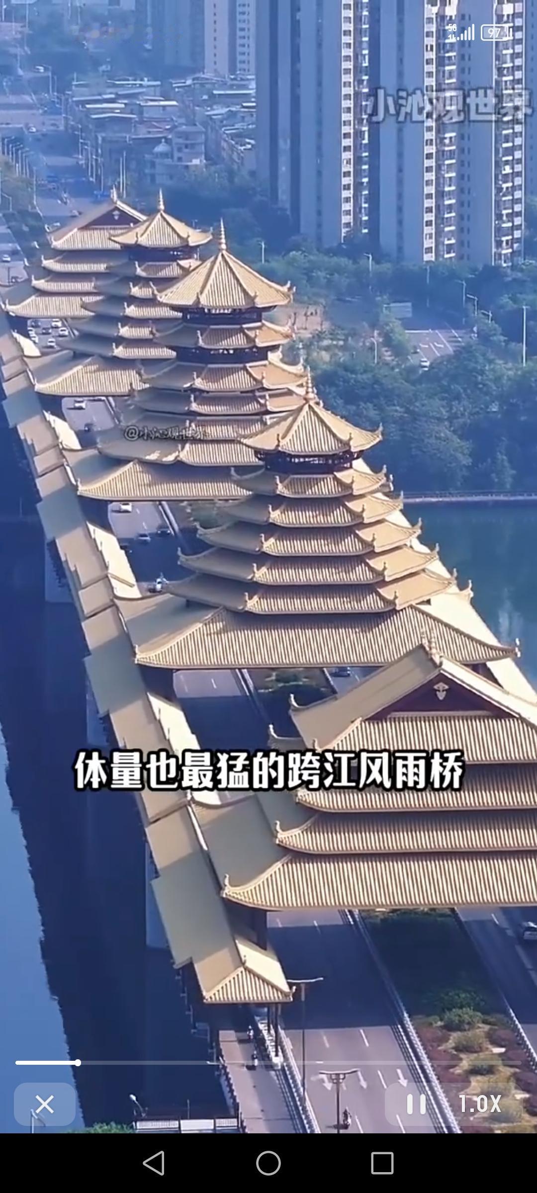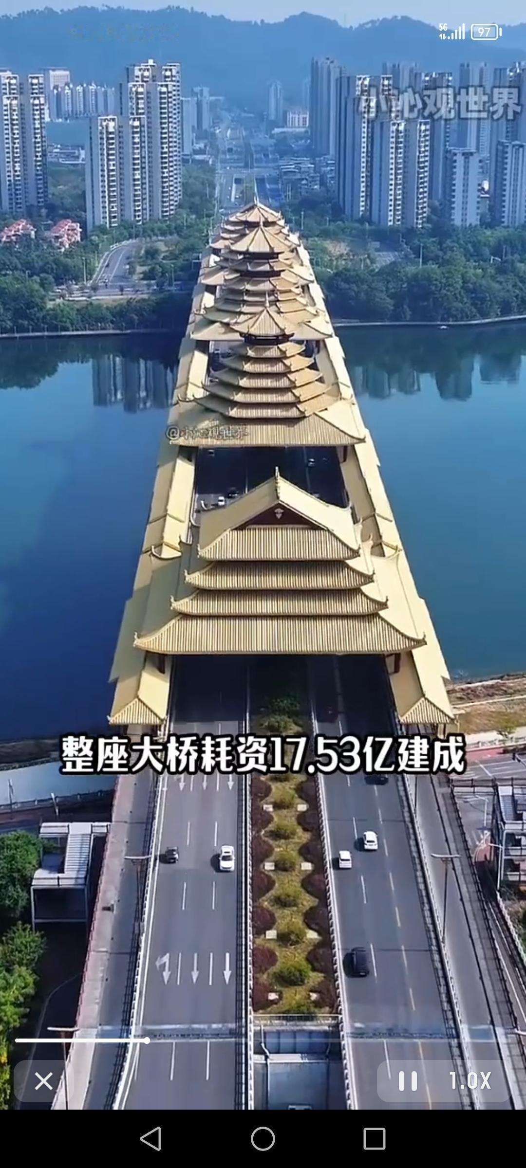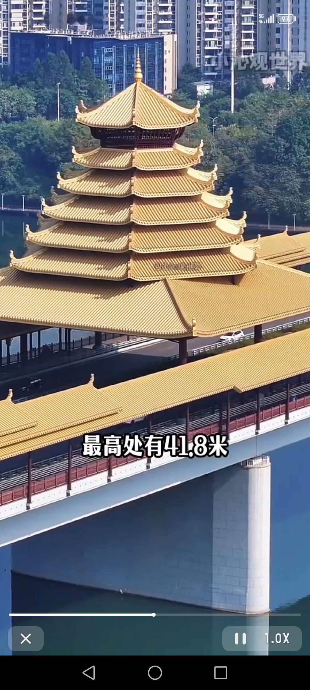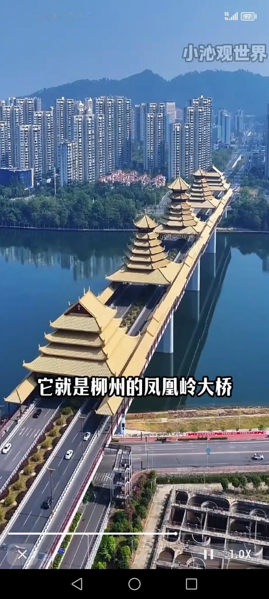 全球跨径最大、体量最猛的跨江风雨桥,就是柳州的凤凰岭大桥!它耗资17.53亿建成,由5座塔(风雨亭)组成,主粱跨径达700米。这5座风雨亭有八角亭、六角亭、歇山亭三种样式,极具侗族特色。