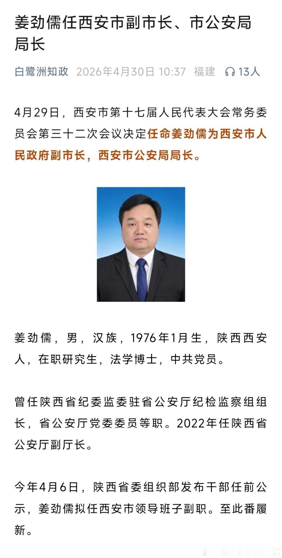 姜劲儒任西安市副市长、市公安局局长
