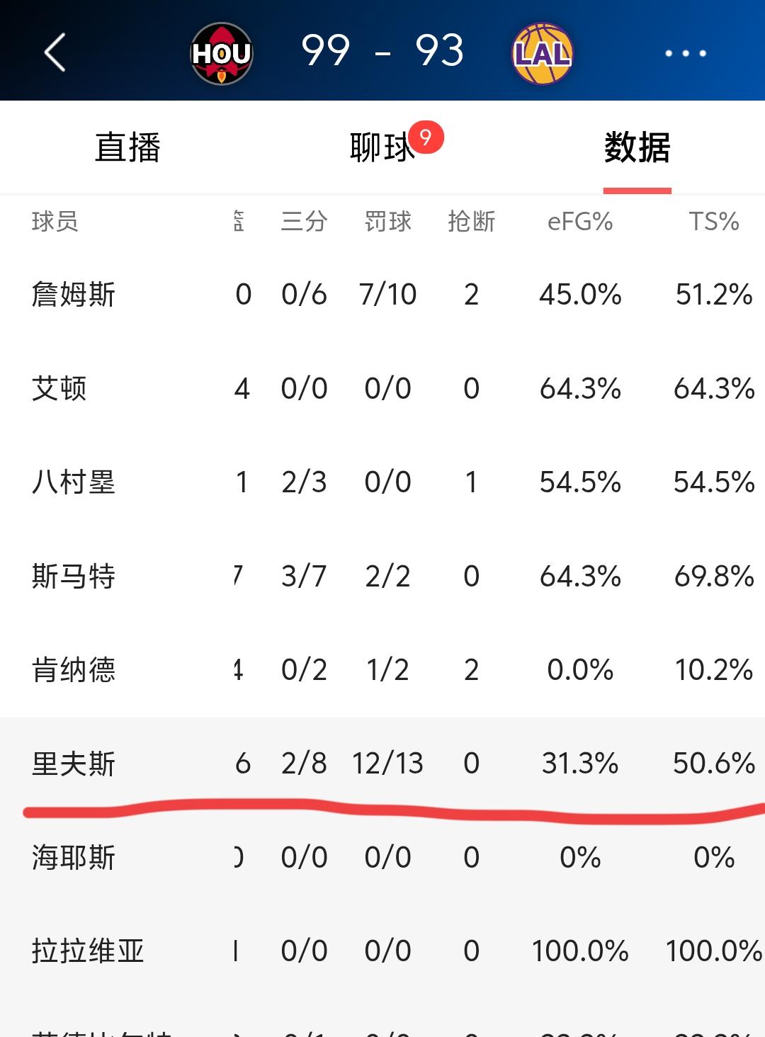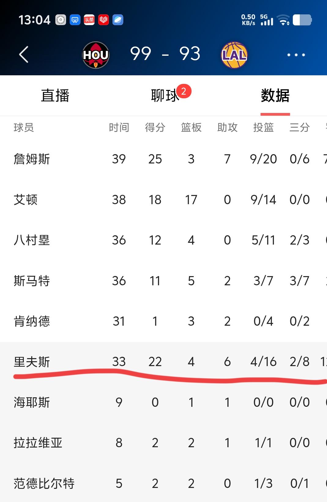 全场比赛里夫斯出战33分钟,16投4中,三分球8投2中,罚球13罚12中,得到了22分4个篮板6次助攻3次失误3次犯规,正负值-5。
