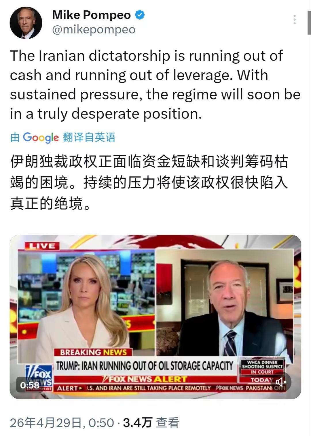 美国前国务卿蓬佩奥4月29日写道:“伊朗独裁政权正面临资金短缺和谈判筹码枯萎的困境。持续的压力将该政权很快正入真正的绝境。”