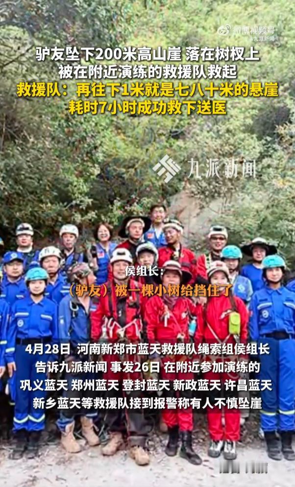 4月28号报道,河南巩义一处陡峭山崖上,一名驴友徒步时不慎失足坠崖,从200米高的崖顶下坠20多米后,被崖间树杈卡住,处境万分危急,不过幸运的是,当时8支蓝天救援队在附近演练,耗时7小时成功将其救下并送往医院救治。