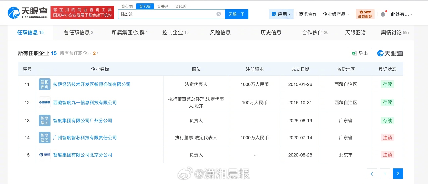 天眼查App显示,陆宏达名下共关联13家存续企业,包括智度科技股份有限公司、国光电器股份有限公司、智度集团有限公司、广州市国光电子科技有限公司、北京智度德正投资有限公司等,版图涉及科技、金融等。陆宏达在上述企业担任董事长、执行董事、总经理等职务,值得一提的是,目前,陆宏达在智度科技股份有限公司、国光电器股份有限公司职位变动暂未完成工商变更。