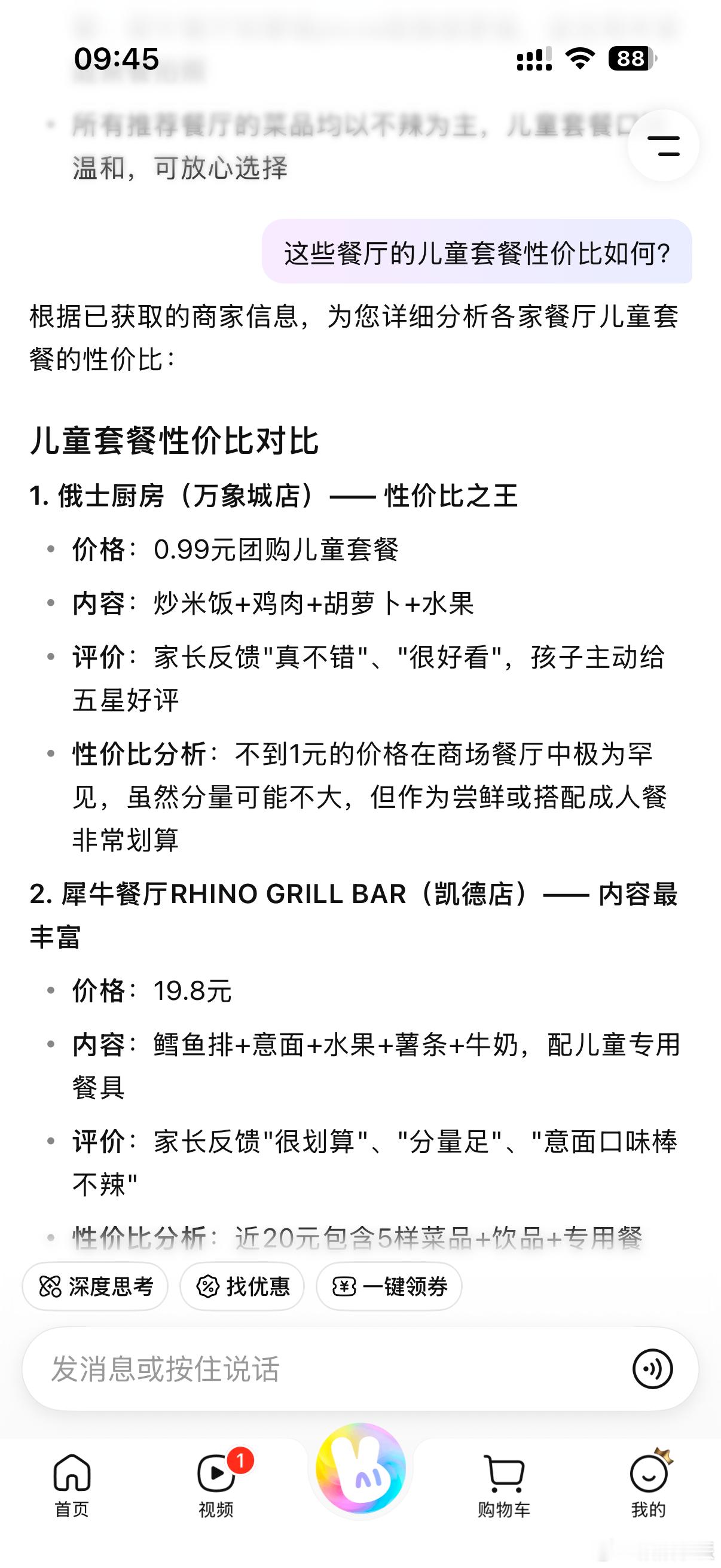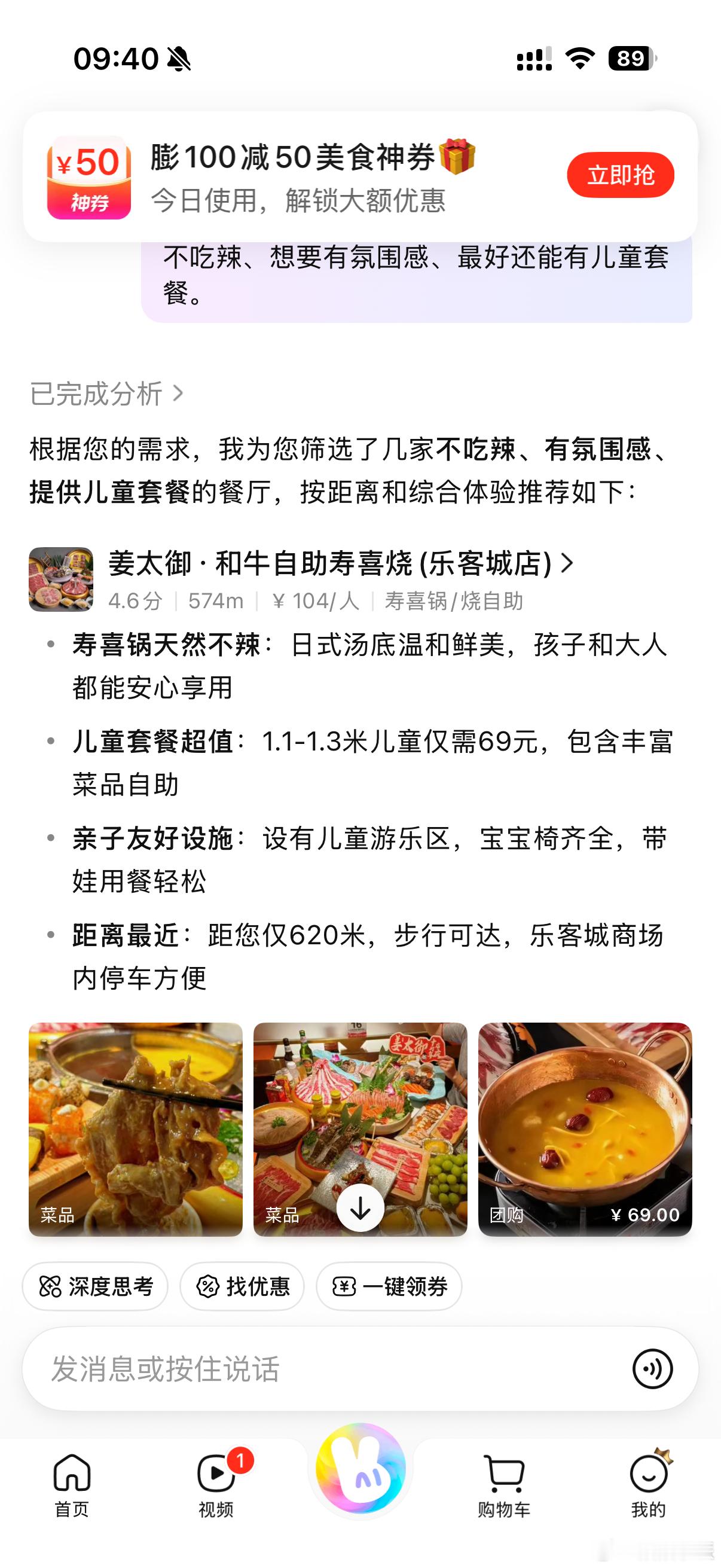 跟它提了要求,不吃辣、想要有氛围感、最好还能有儿童套餐。过一会直接甩我一份路线攻略+团购套餐,而且还会主动帮找优惠券,我直接美美买套餐,然后出门、张嘴、拍照就完事了。