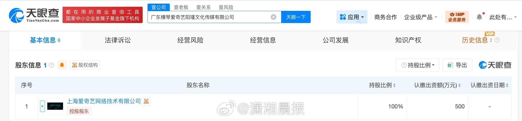 【#爱奇艺新公司含AI软件开发业务#】#爱奇艺新公司含AI相关业务#天眼查App显示,近日,广东横琴爱奇艺阳瑾文化传媒有限公司成立,法定代表人为王瑞阳,注册资本500万人民币,经营范围含广告发布、数字广告制作、数字广告发布、组织文化艺术交流活动、市场营销策划、社会经济咨询服务、信息系统集成服务、人工智能应用软件开发等。股东信息显示,该公司由爱奇艺旗下上海爱奇艺网络技术有限公司全资持股。
