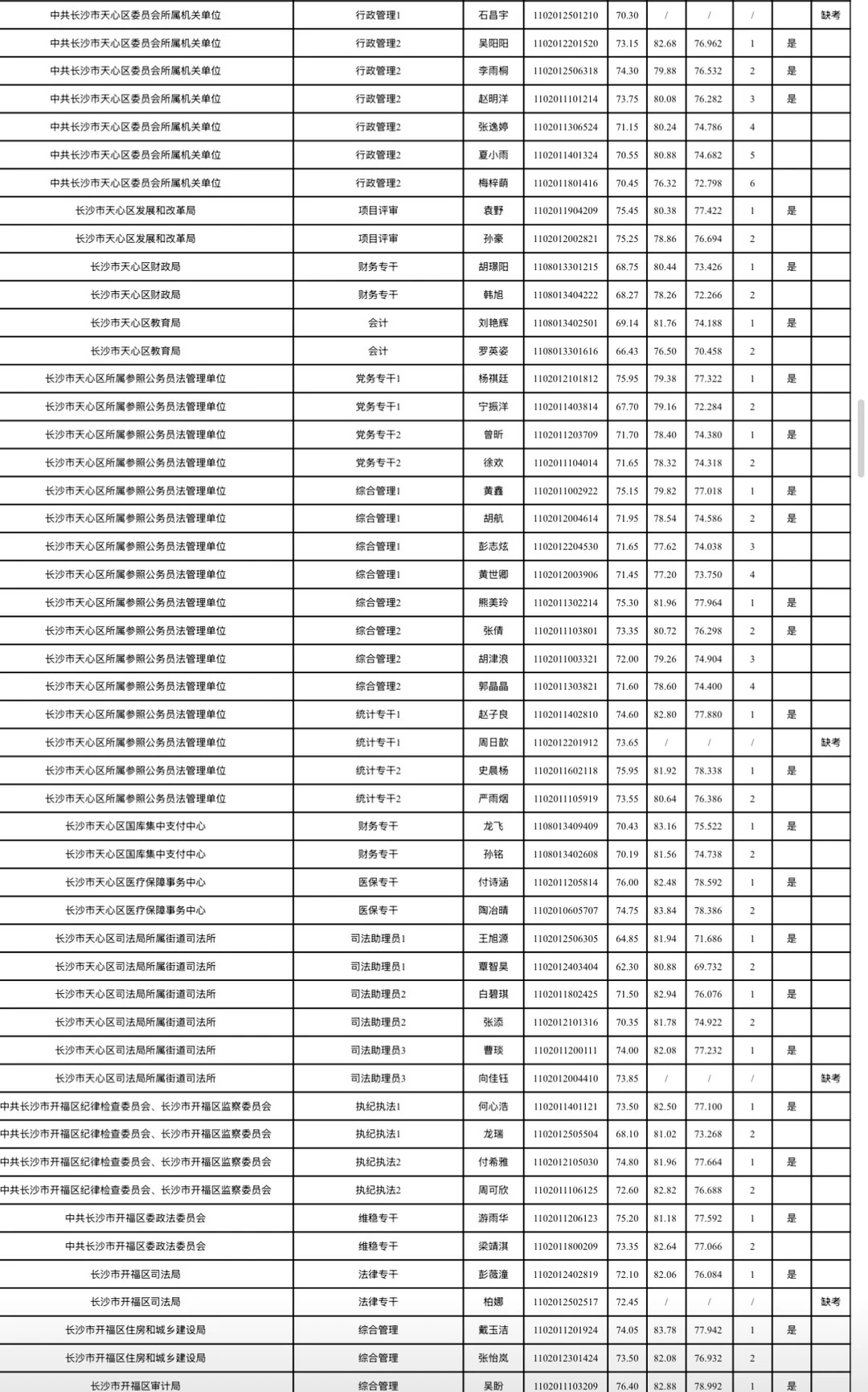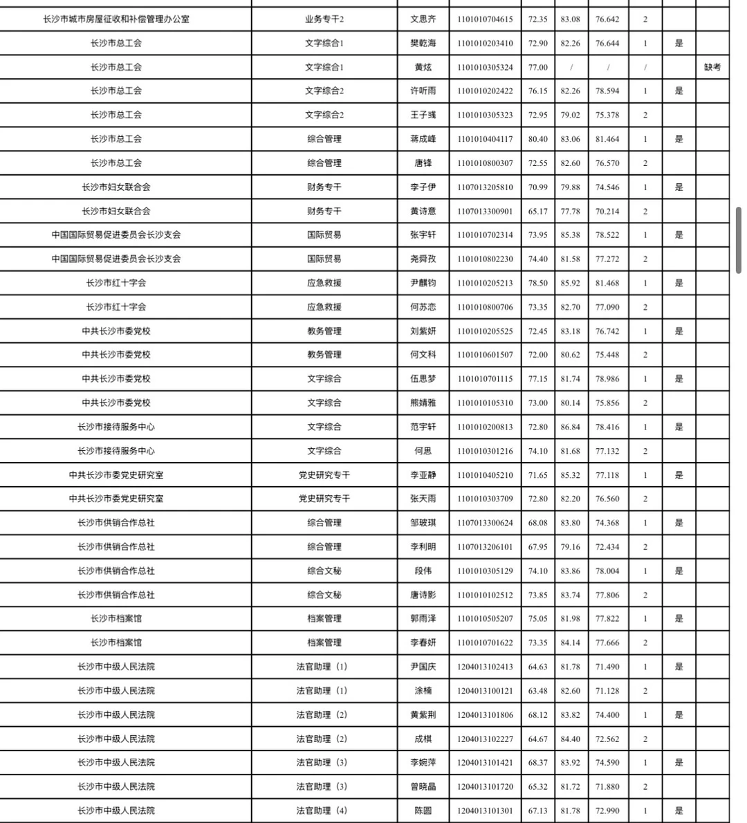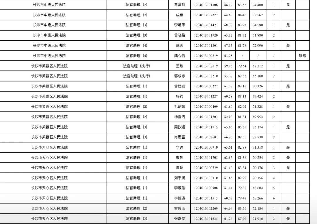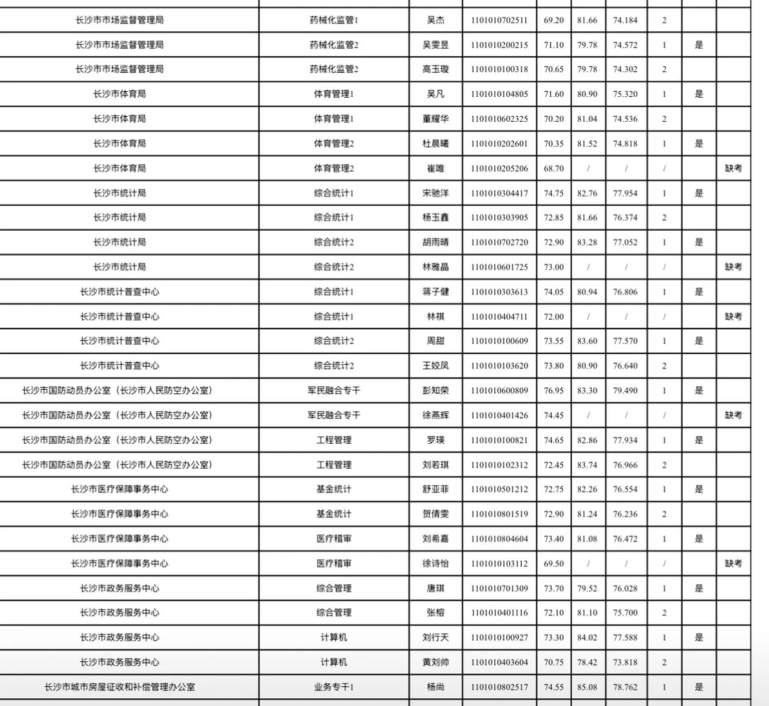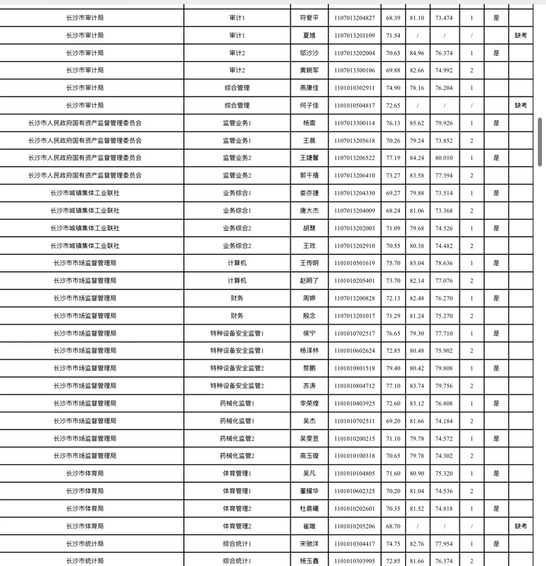 长沙市2026年考试录用公务员综合成绩排名及入围体检情况公告根据《湖南省2026年考试录用公务员公告》规定,经笔试、资格审查(体能测评)、面试等环节,按照招考职位计划1:1的比例,在参加面试人员中按综合成绩从高分到低分的顺序确定体检对象;招录职位实际参加面试人数没有形成有效竞争的,报考人员面试成绩必须不低于当场(同一场次、同一面试考官组、同一套面试题本)形成有效竞争职位入围体检人员的最低分数。根据政策规定,现将长沙市2026年考试录用公务员面试考生综合成绩排名及入围体检情况公布(见附件)。各招录机关近期将按公务员考试录用规定开展体检、考察等工作,请入围考生保持通讯畅通。