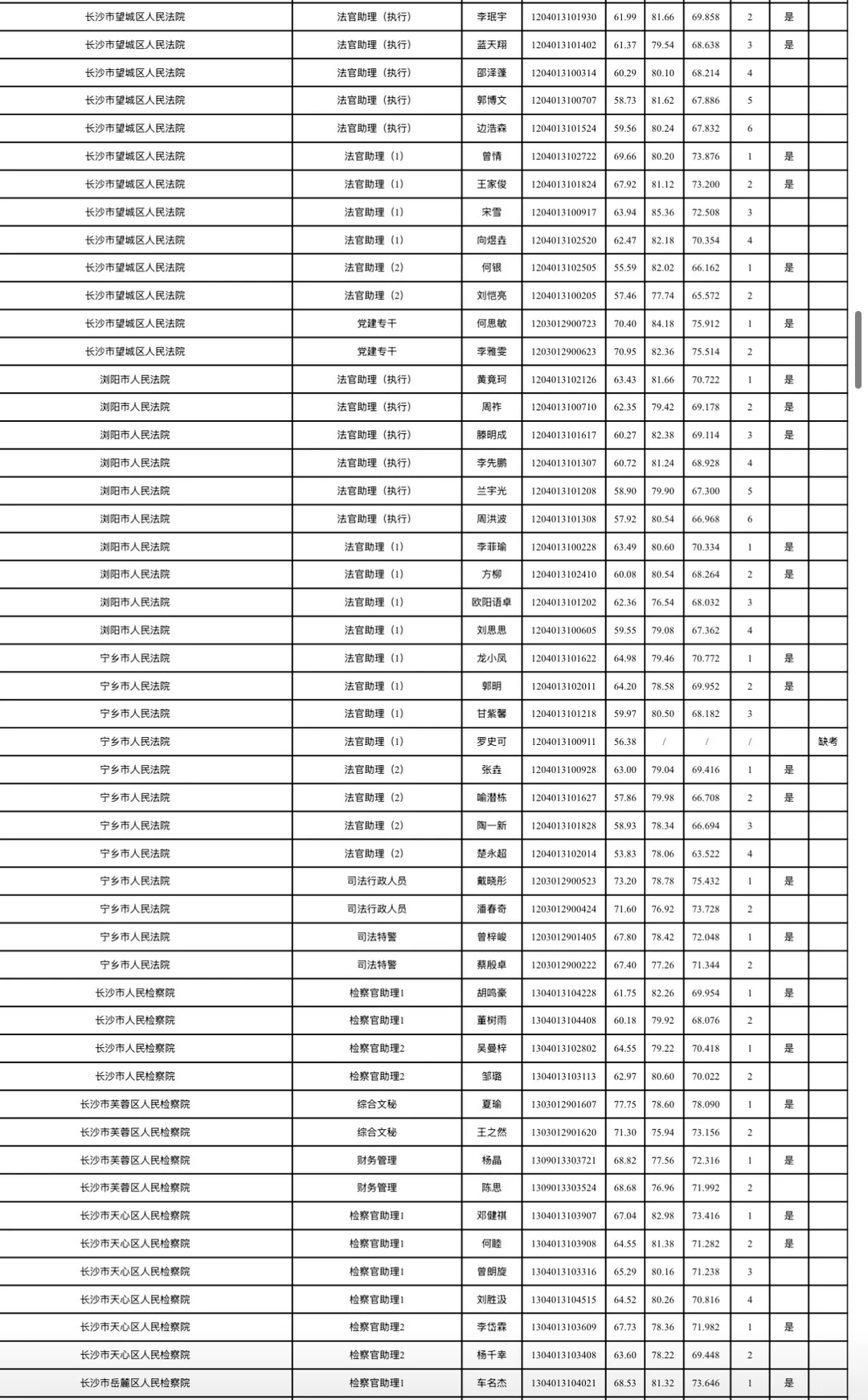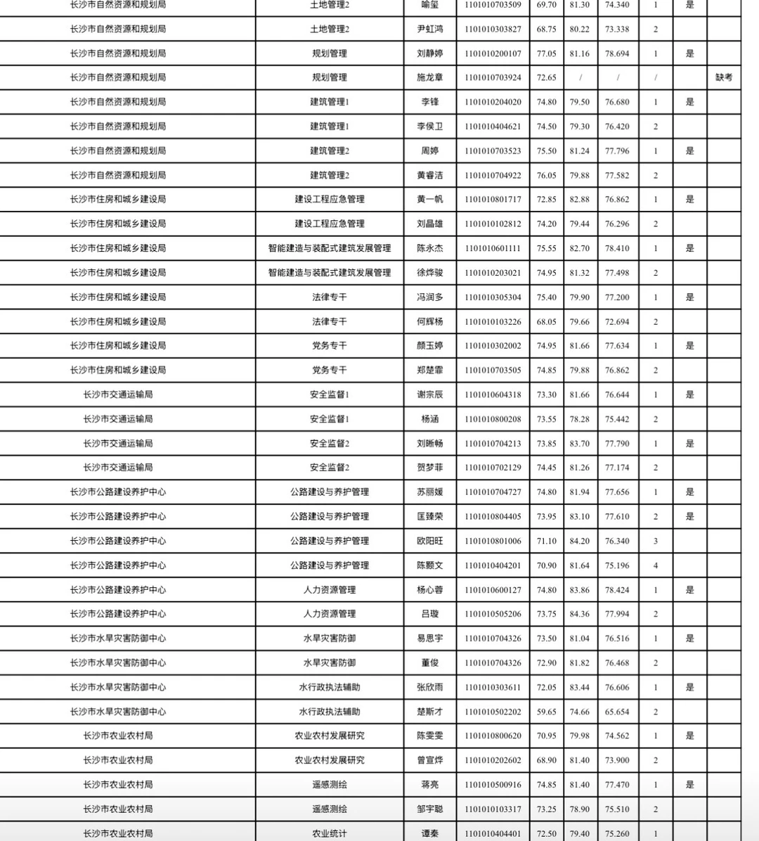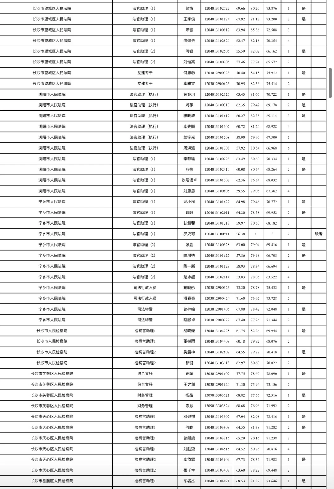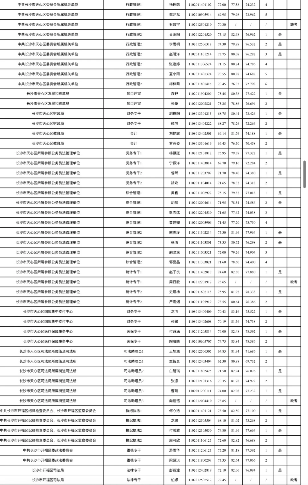 长沙市2026年考试录用公务员综合成绩排名及入围体检情况公告根据《湖南省2026年考试录用公务员公告》规定,经笔试、资格审查(体能测评)、面试等环节,按照招考职位计划1:1的比例,在参加面试人员中按综合成绩从高分到低分的顺序确定体检对象;招录职位实际参加面试人数没有形成有效竞争的,报考人员面试成绩必须不低于当场(同一场次、同一面试考官组、同一套面试题本)形成有效竞争职位入围体检人员的最低分数。根据政策规定,现将长沙市2026年考试录用公务员面试考生综合成绩排名及入围体检情况公布(见附件)。各招录机关近期将按公务员考试录用规定开展体检、考察等工作,请入围考生保持通讯畅通。