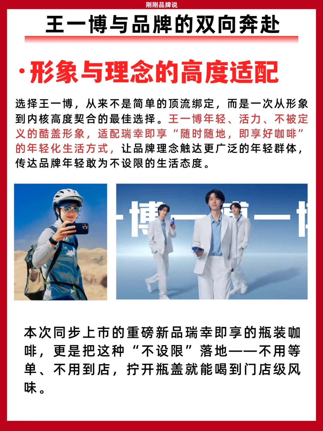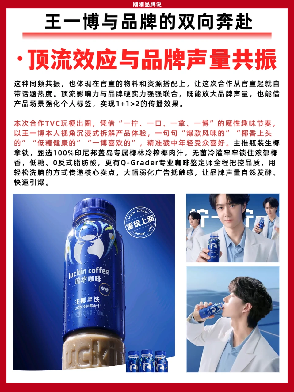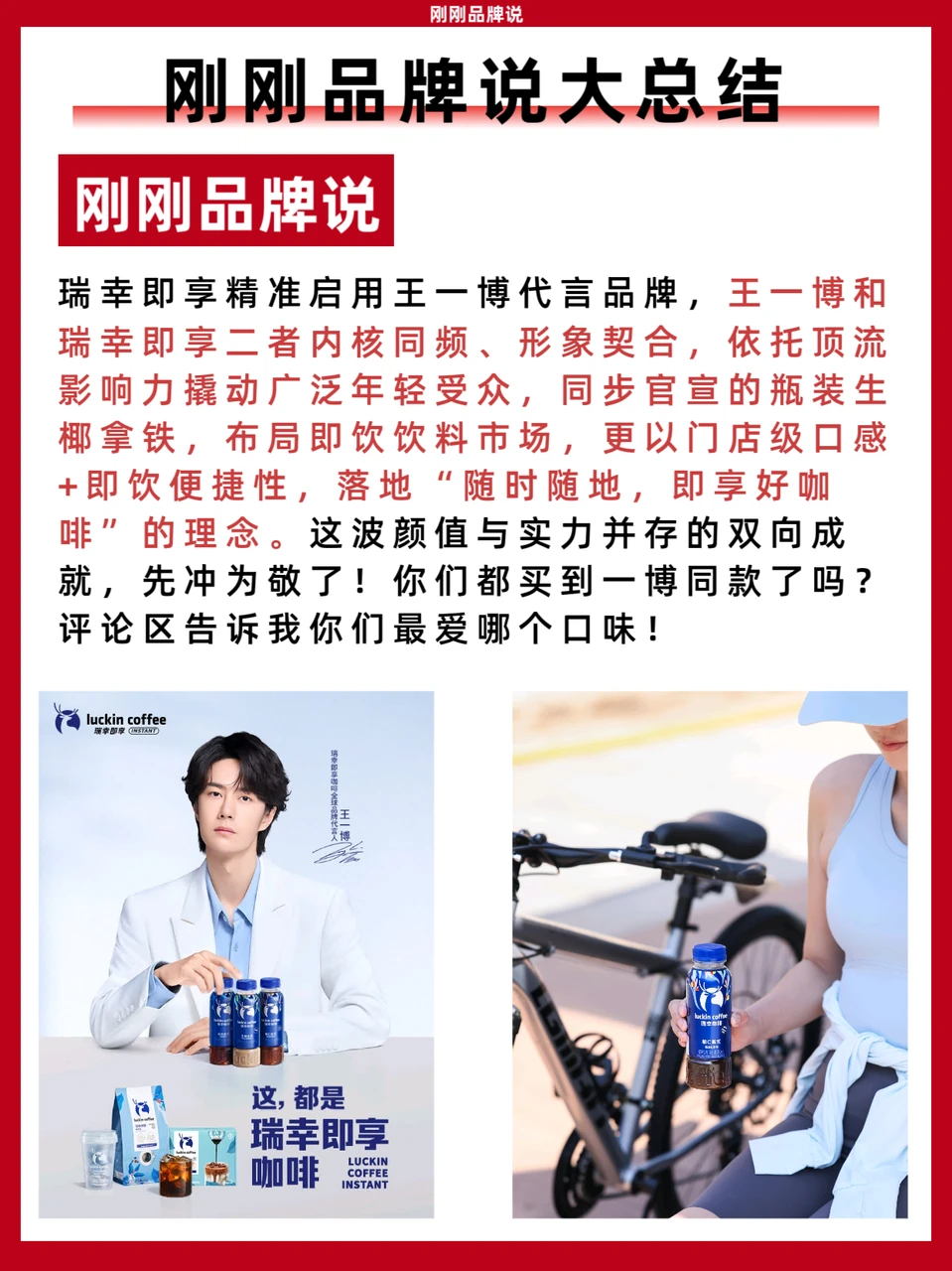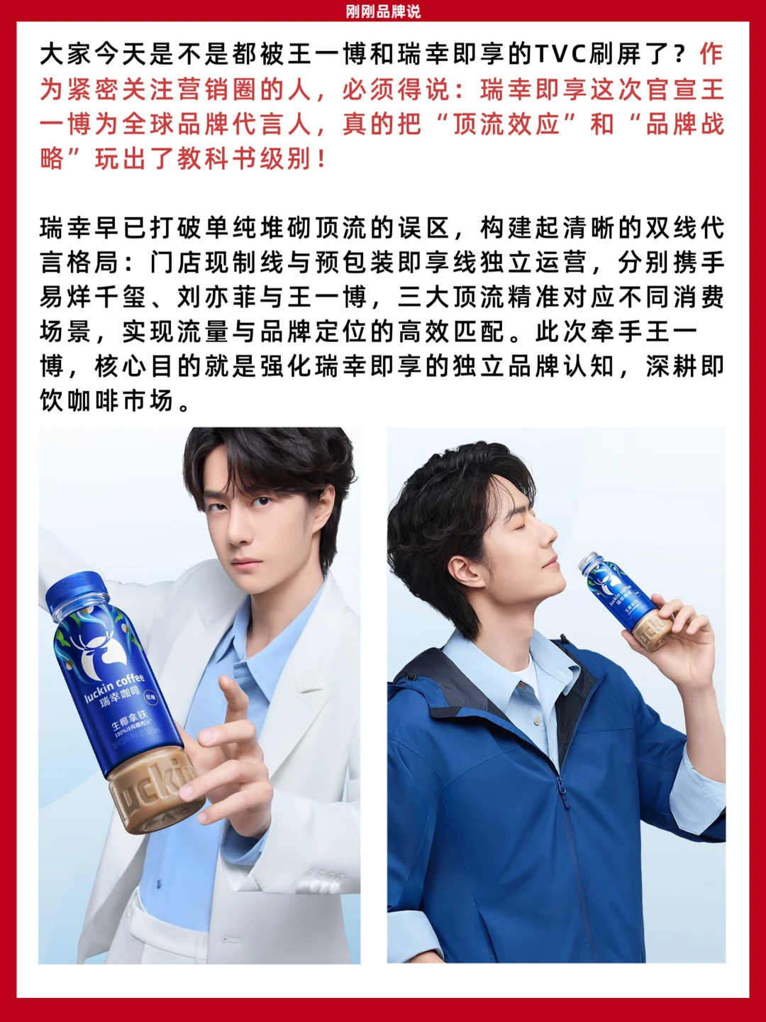 瑞幸即享精准启用王一博代言品牌,王一博和瑞幸即享二者内核同频、形象契合,依托顶流影响力撬动广泛年轻受众,同步官宣的瓶装生椰拿铁,布局即饮饮料市场,更以门店级口感+即饮便捷性,落地“随时随地,即享好咖啡”的理念。这波颜值与实力并存的双向成就,先冲为敬了!你们都买到一博同款了吗?评论区告诉我你们最爱哪个口味!