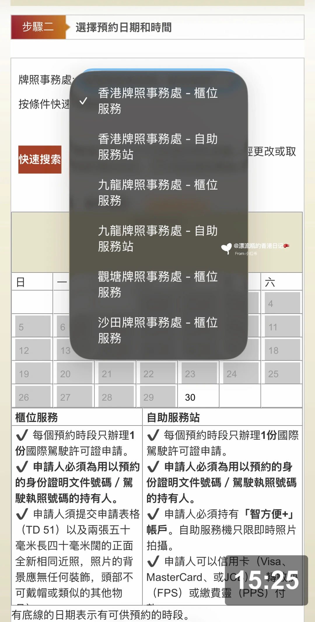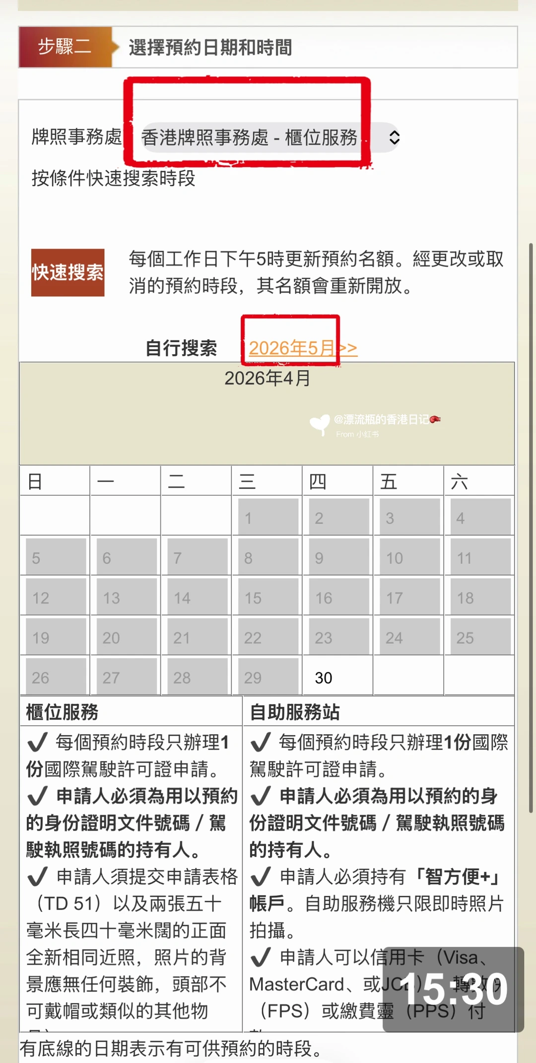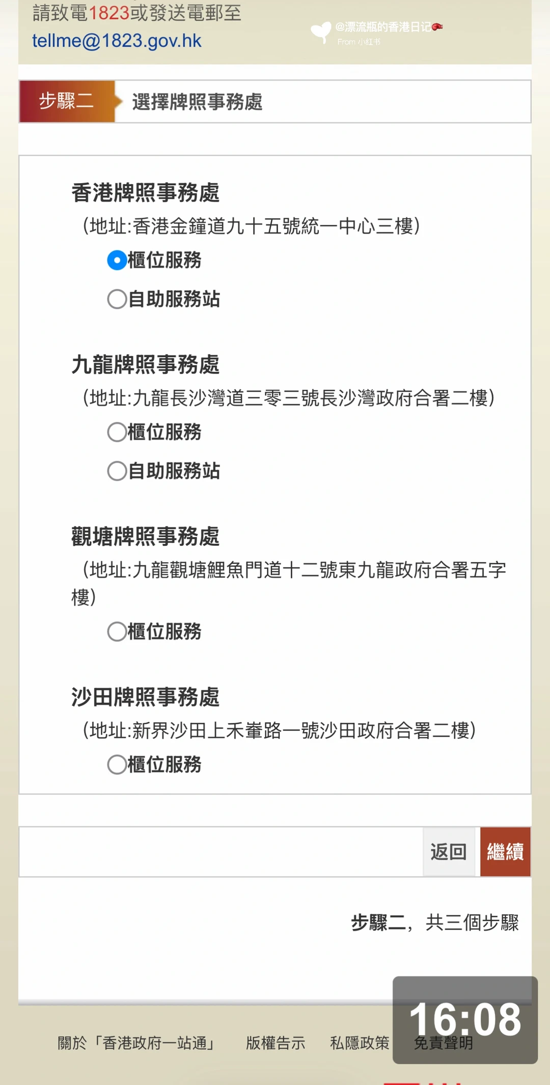 进去后图10至13依次点➡️图14填资料并点下一步➡️图15可以看到四个办事处地点,只有前两个有自助服务站,选一个➡️图16选日期和时间