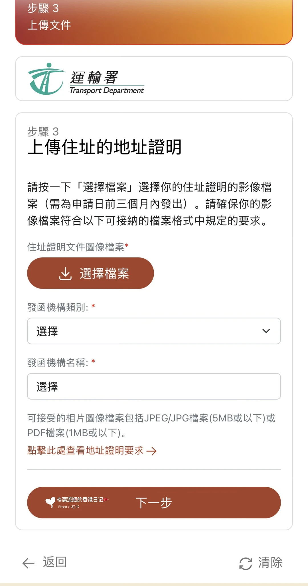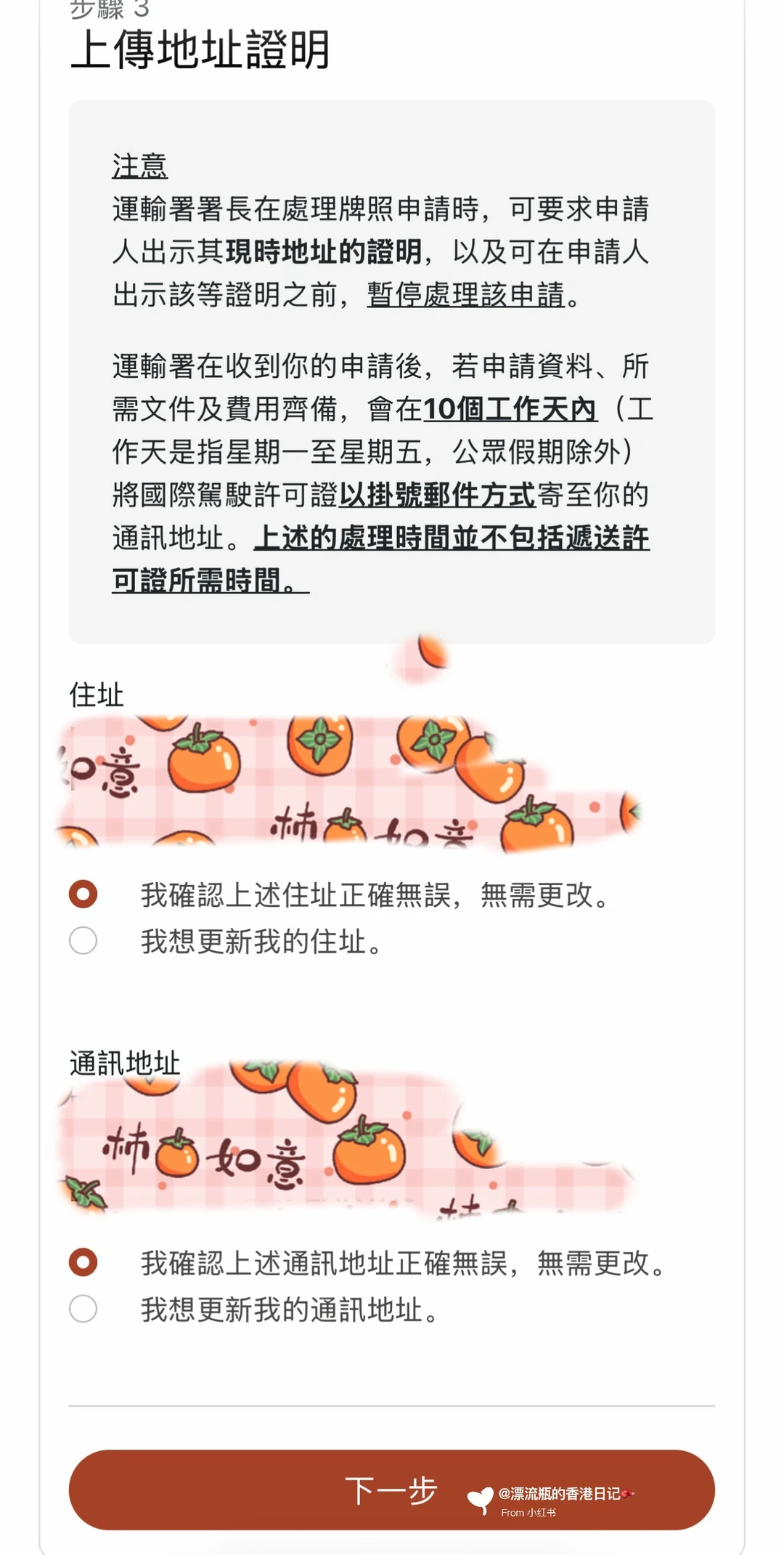 打开智方便App➡️图2、3➡️图4、5➡️图6填资料📃申请类别选“私家车”➡️图7手机接收输入验证码➡️图8确认住址和通讯地址➡️图9上传住址证明(水电燃气单、银行单、物业收费单等都可以),发函机构名称类别都要写➡️下一步是上传证件照(需裁剪以符合尺寸像素规定)➡️在线付款80HKD,转数快、信用卡💳都可以➡️提交后会收到邮件