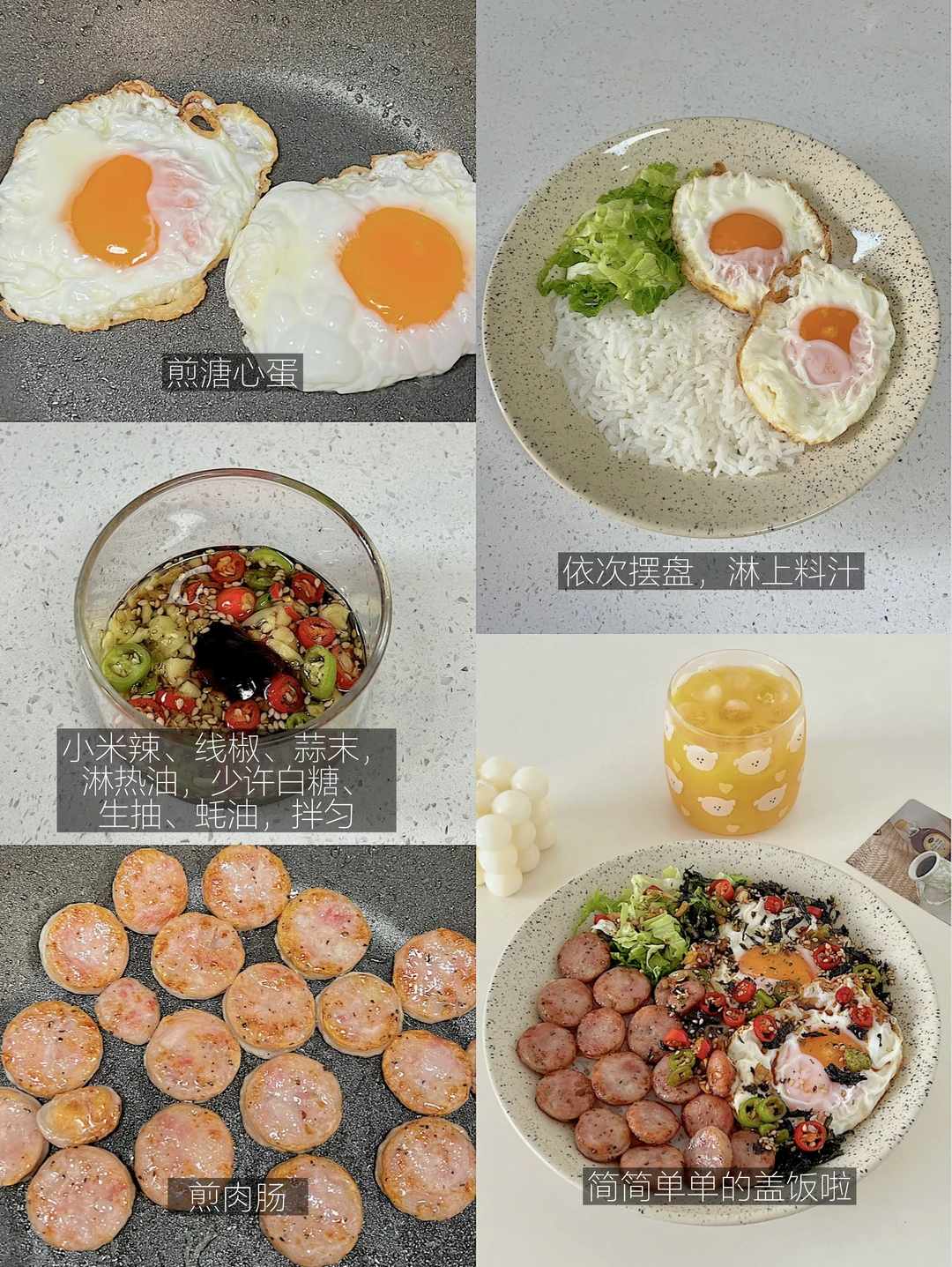 4. 碗底铺米饭,依次摆上溏心蛋、生菜、煎好的肉肠。