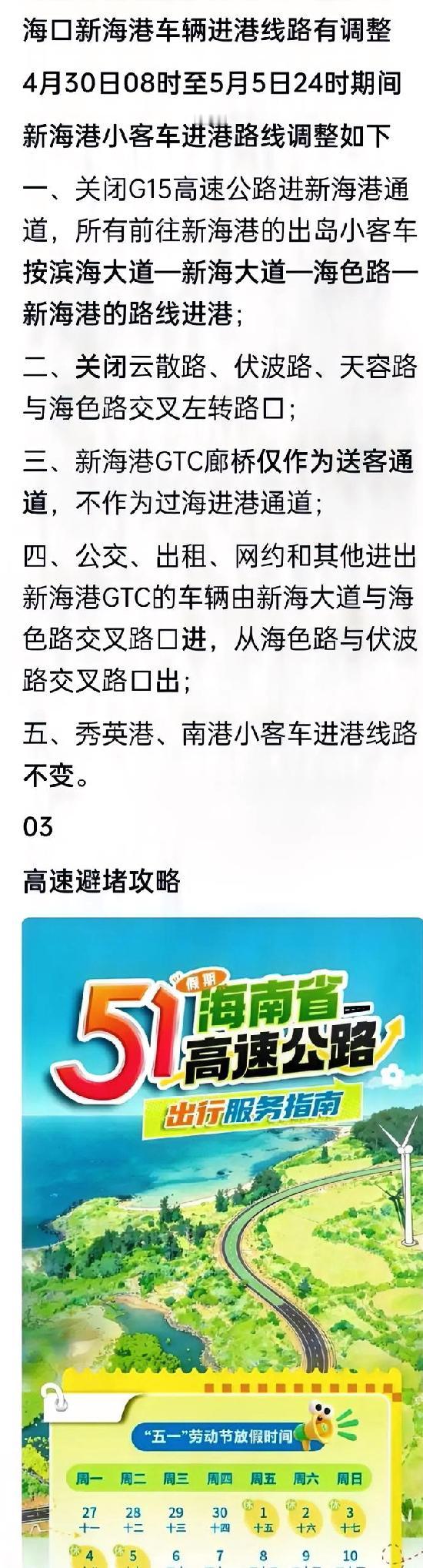 【五一海南高速避堵宝典!新海港进港路线公布,这些时段及路段最堵,老牛给你划重点】老铁们,明天就是五一假期了。今天下午开始,出城大军已经上路,再加上新海港进港路线今天起有大调整。老牛把海南省公路管理局最新发布的出行指南整理好了,一篇看完,少走弯路。
