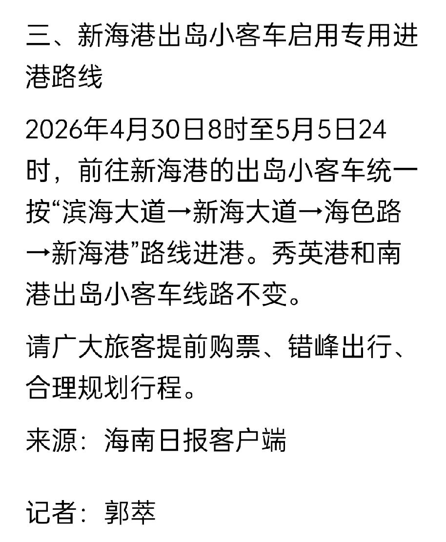 海口市交通运输和港航管理局联合通告,4月30日8时至5月5日24时,新海港小客车进港路线调整如下: