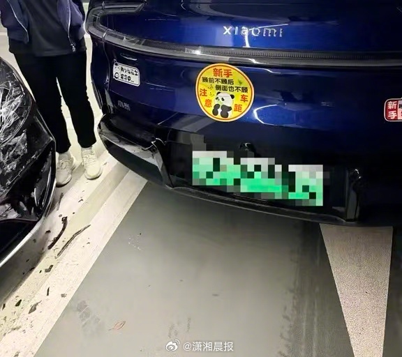 记者在事故照片中还发现,这辆小米的车尾平均分布了三个实习车贴,其中一个车贴上写着“顾前不顾后,侧面也不顾”。