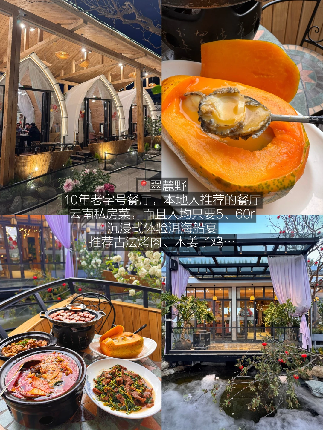10年老字号餐厅,本地人推荐的餐厅,古法烤肉外焦里嫩,油香四溢,蘸辣椒面就更香了! 木姜子鸡鸡肉很嫩也不错,真的超级好吃的云南私房菜,而且人均只要5、60r,一边吃饭一边沉浸式体验洱海船宴…