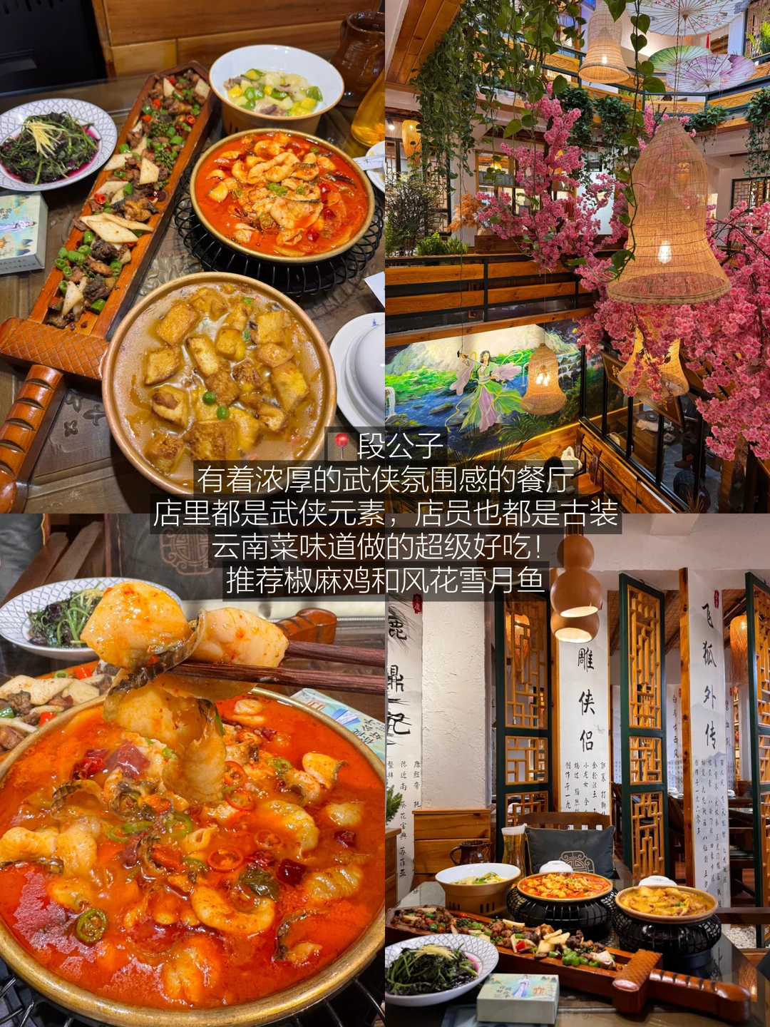 有着浓厚的武侠氛围感的餐厅,店里都是武侠元素,店员也都是古装,云南菜味道做的超级好吃!椒麻鸡一定要点,长剑的造型装盘太有特色了,风花月鱼鱼肉大片大片的没有什么刺,里面的米线也很好吃