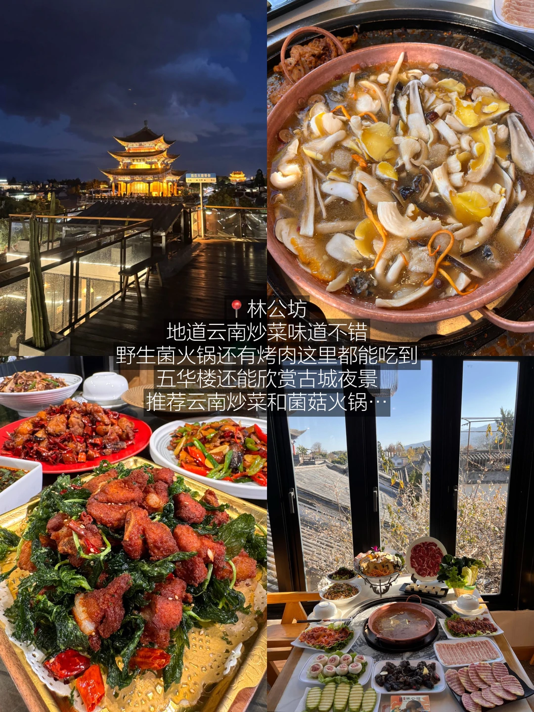 云南炒菜这里味道不错,野生菌火锅还可以搭配烤肉,还能欣赏五华楼和古城夜景…乌鸡和各种菌子放在锅里煮,菌汤鲜美到可以连喝三碗!