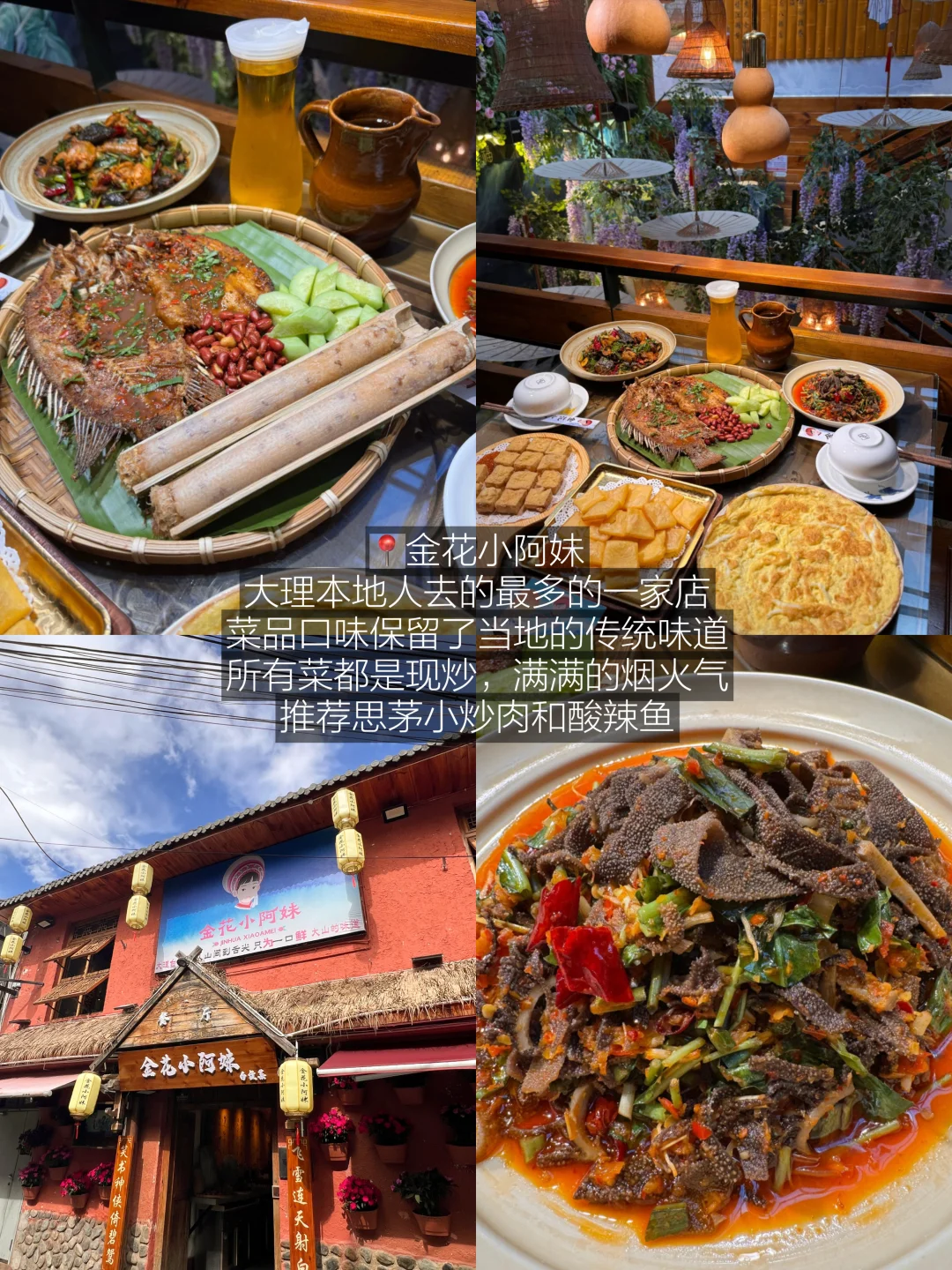 大理本地人去的最多的一家店,菜品口味保留了当地的传统味道,所有菜都是现炒,满满的烟火气,思茅小炒肉猪肉猛火爆炒,佐料香气很下饭!酸辣鱼鲜辣醇厚入味,鱼肉嫩滑,浓郁开胃!