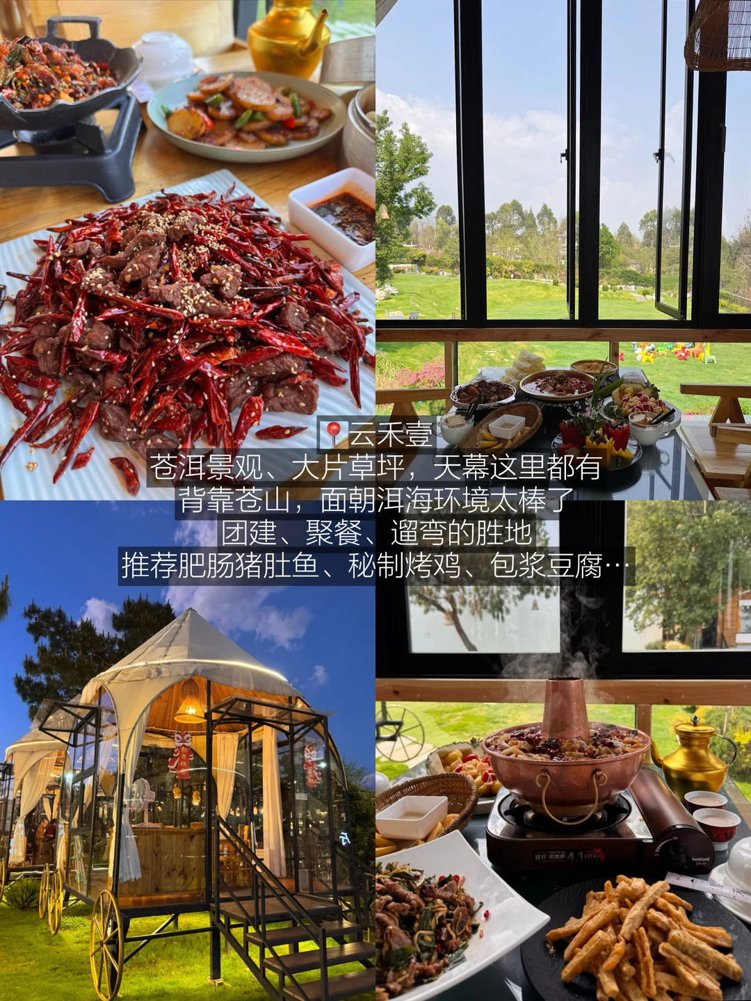 苍洱景观、大片草坪,天幕这里都有,视野很开阔,背靠苍山,面朝洱海环境太棒了,推荐肥肠猪肚鱼、秘制烤鸡、包浆豆腐…适合团建、聚餐,是遛弯的胜地!