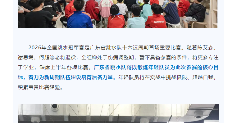 【#全红婵将缺席上半年比赛#】#全红婵处于伤病调整期# 4月30日,广东省二沙体育中心发文表示:全红婵处于伤病调整期,暂不具备参赛的条件,将更多专注于学业,缺席上半年各项比赛,广东省跳水队将以锻炼年轻队员为此次参赛的核心目标,着力为新周期队伍建设培育后备力量。年轻队员将在实战中挑战极限、超越自我,积累宝贵比赛经验。网页链接