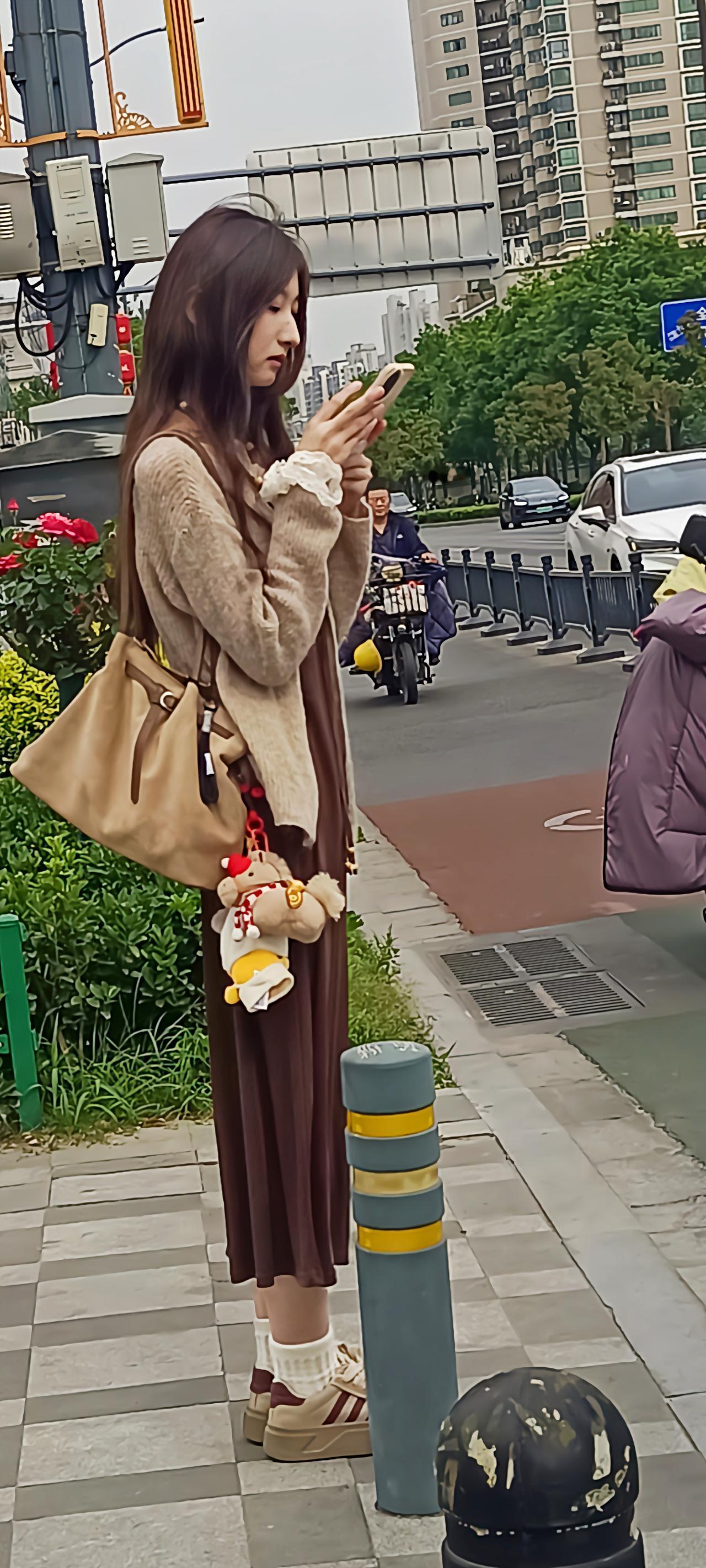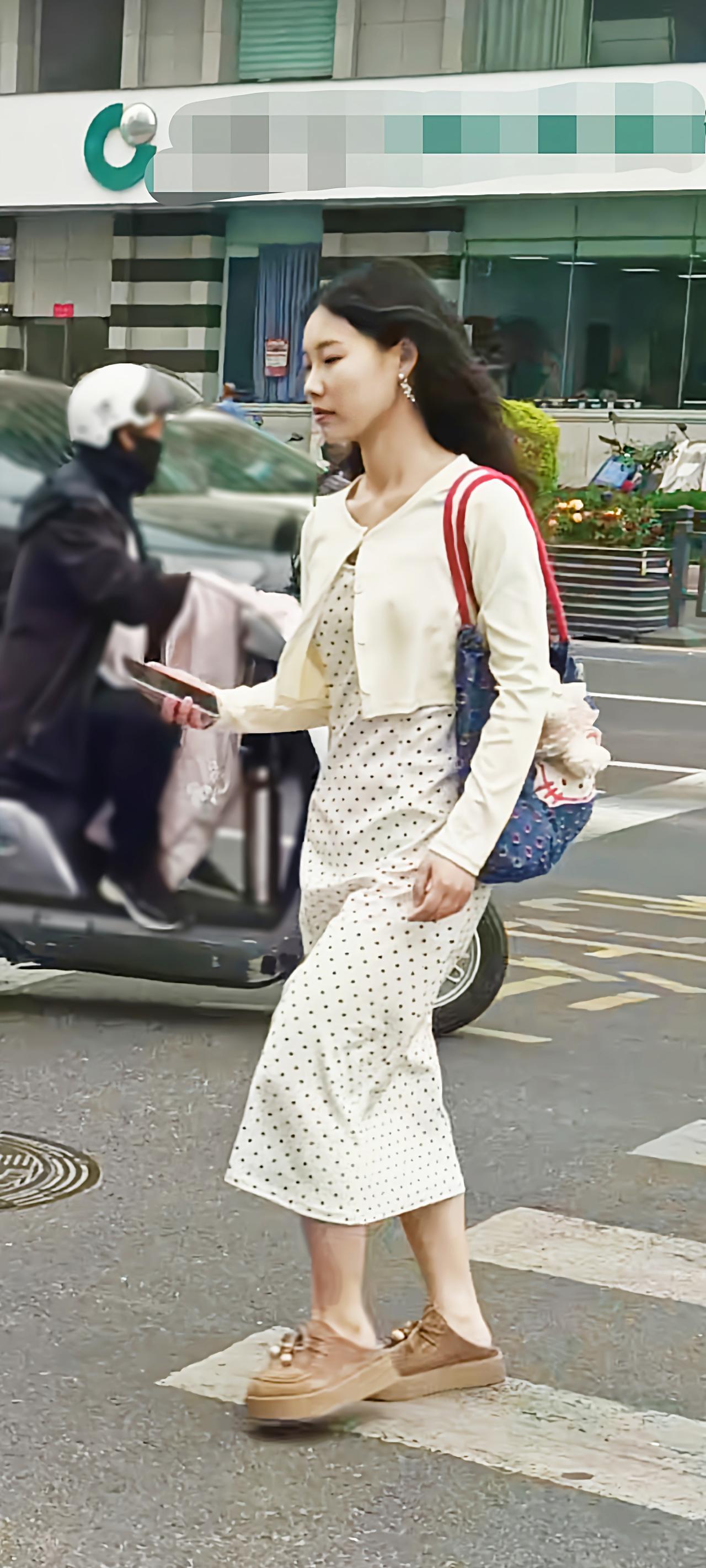 张子枫街拍瘦成“纸片人”,这一套复古温柔!焦糖短款针织开衫搭配同色系做旧阔腿裤,