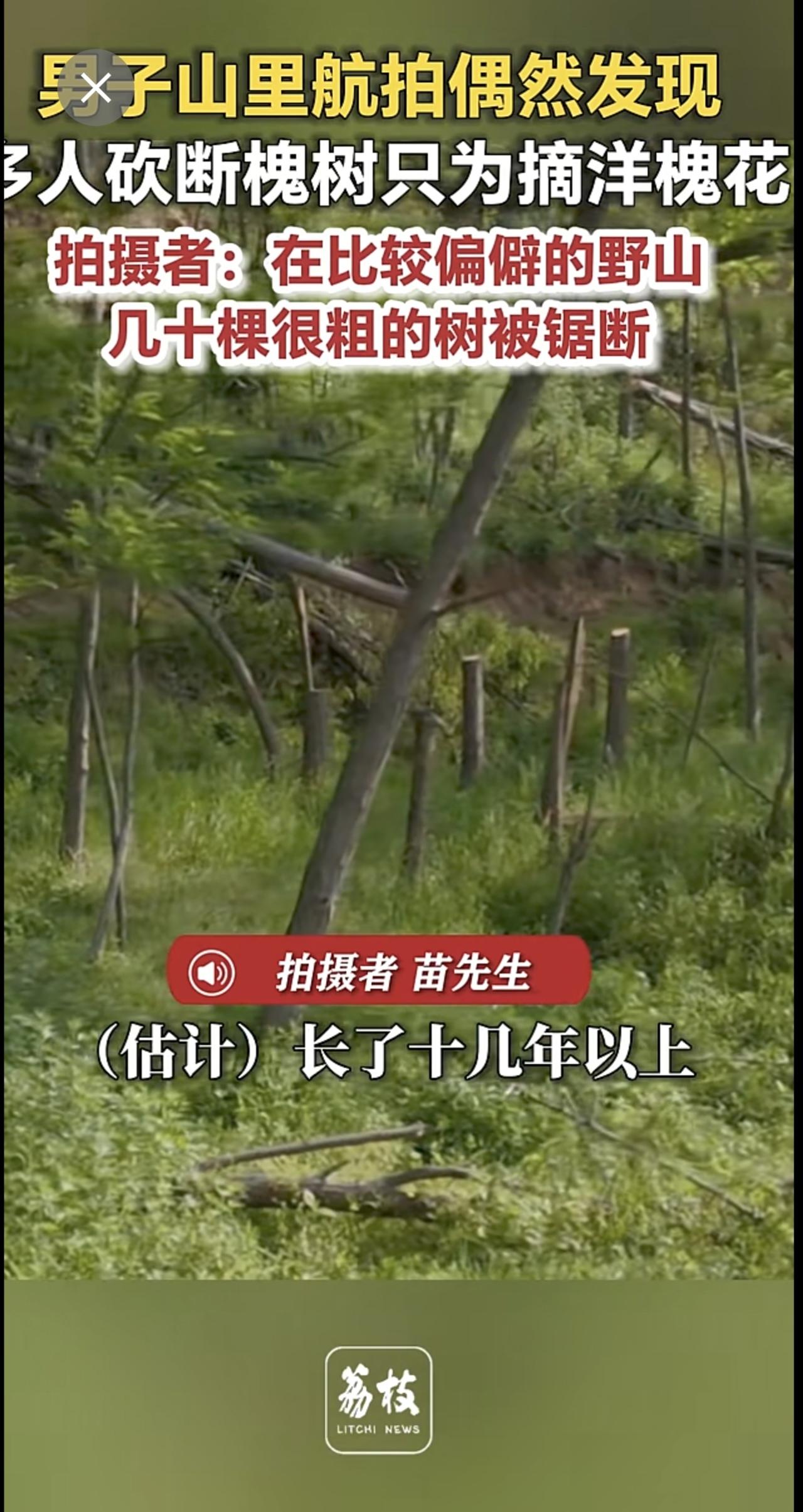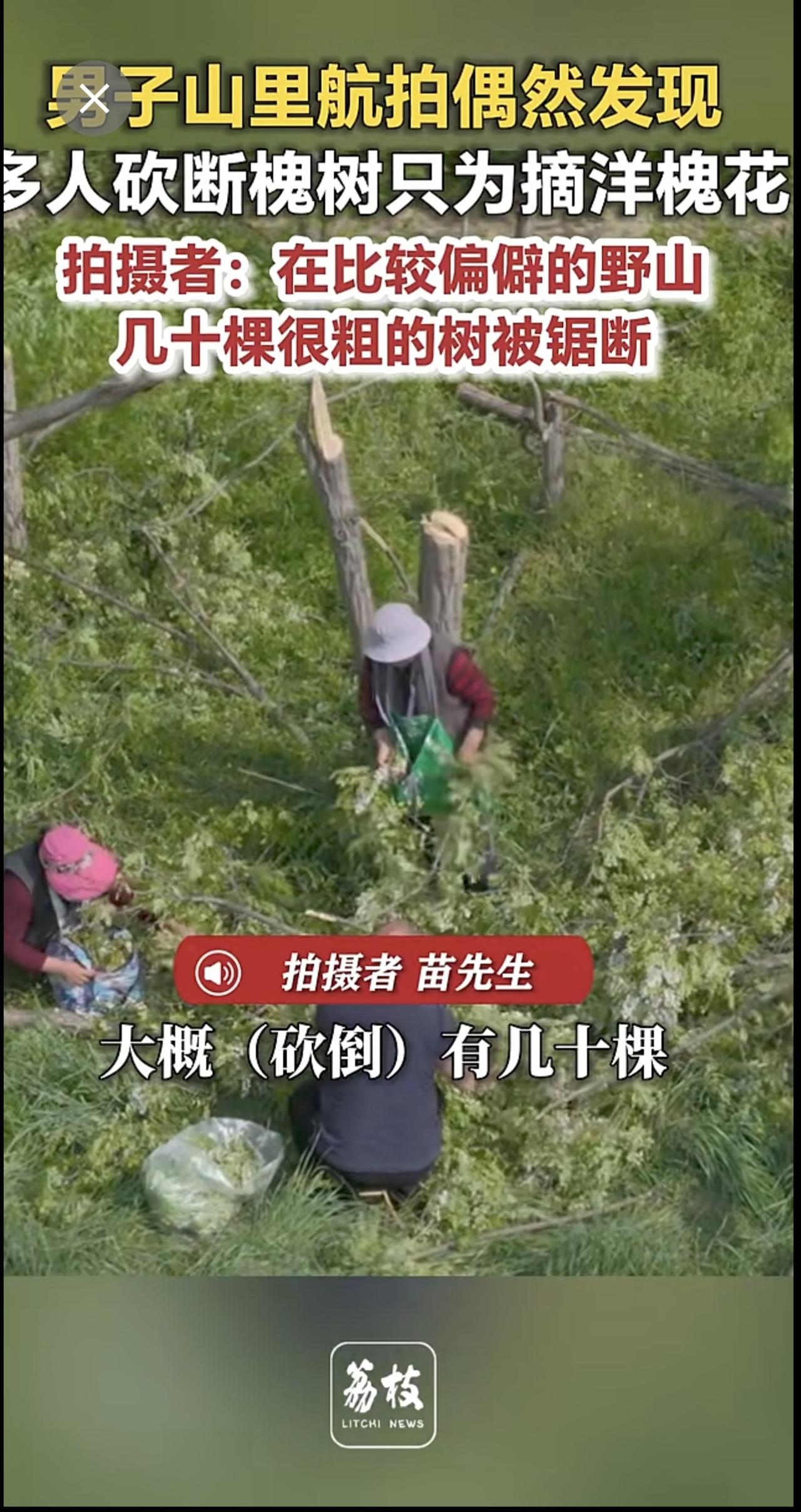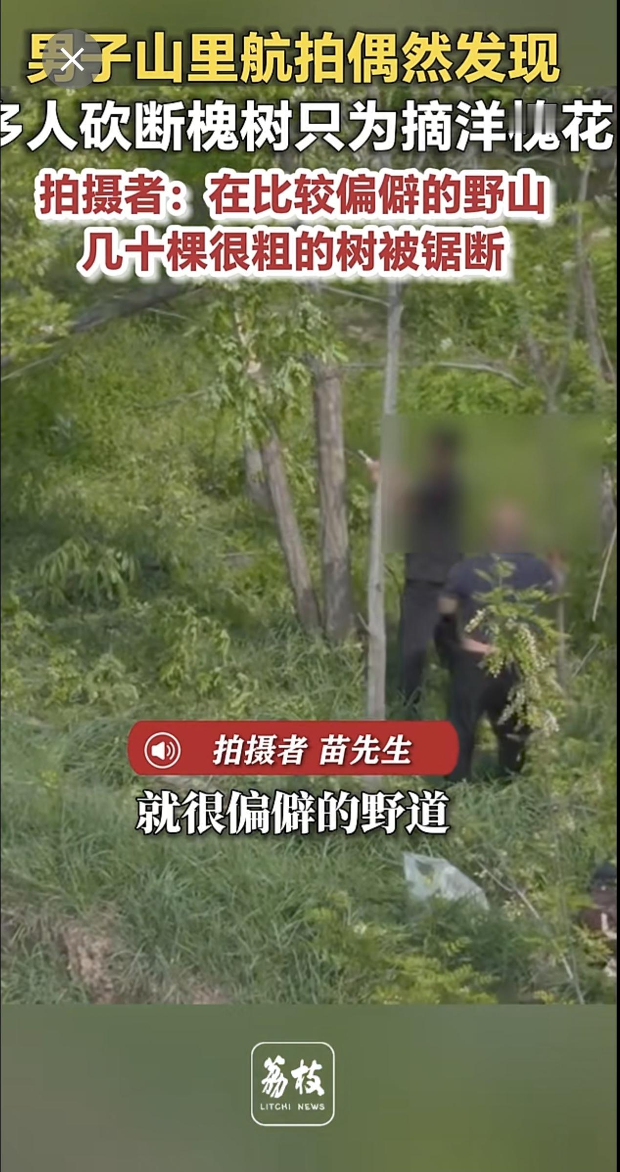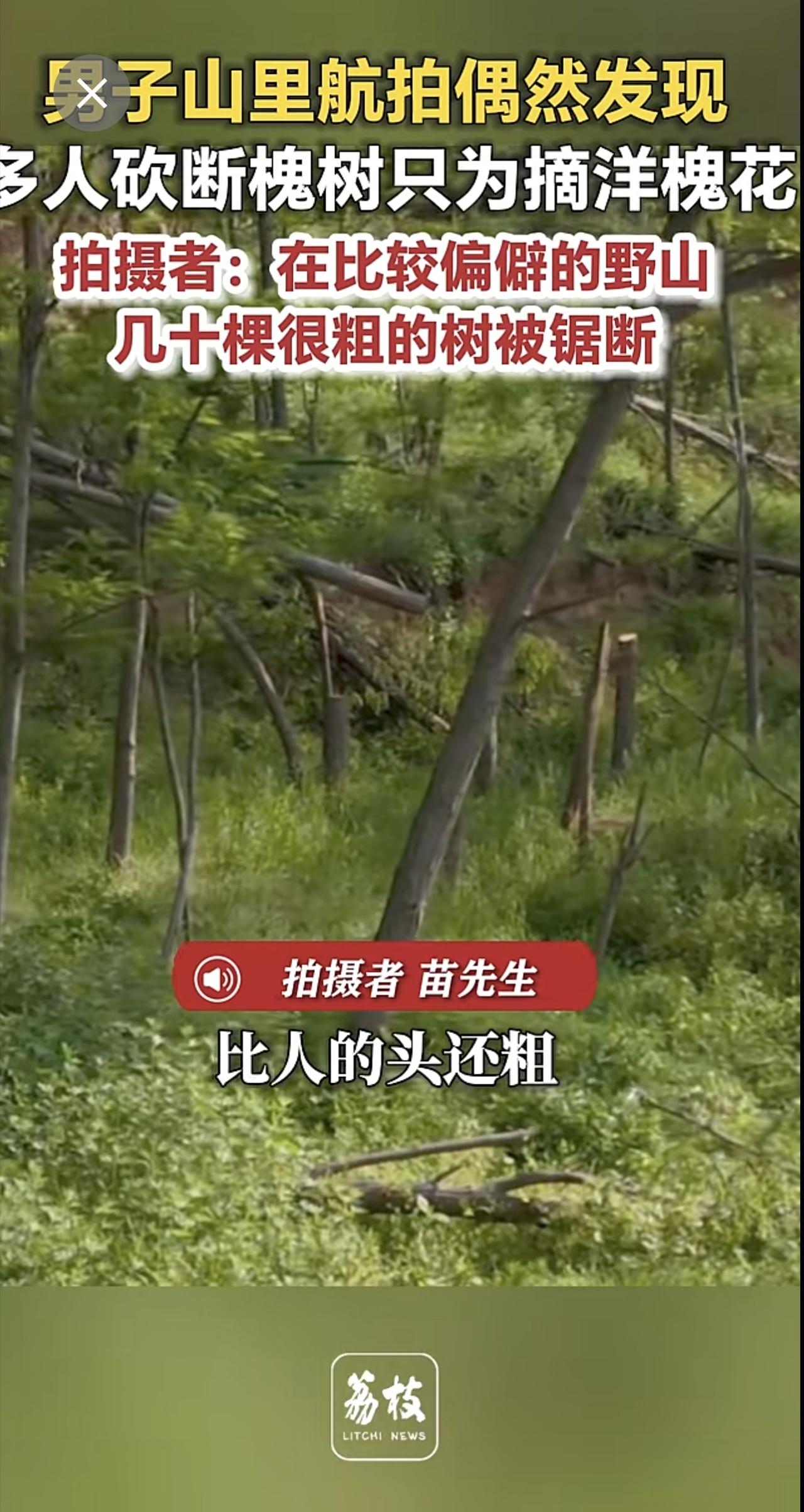 男子山里航拍偶然发现 多人砍断槐树只为摘洋槐花 拍摄者:在比较偏僻的野山 几十棵很粗的树被锯断保护自然