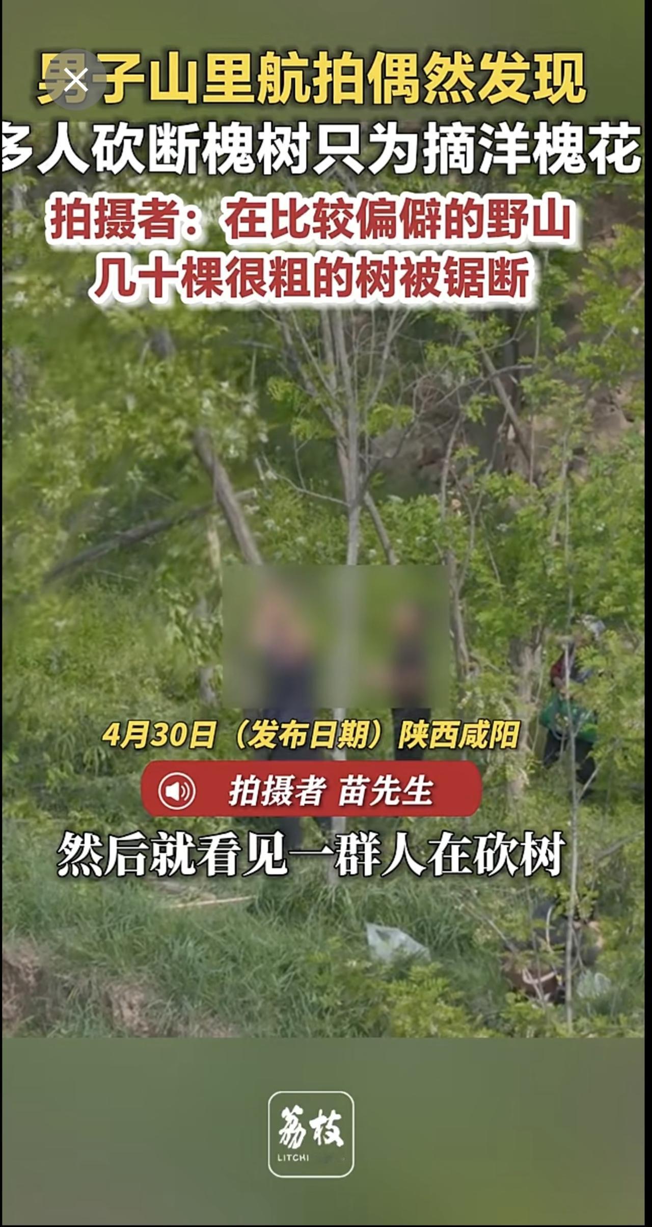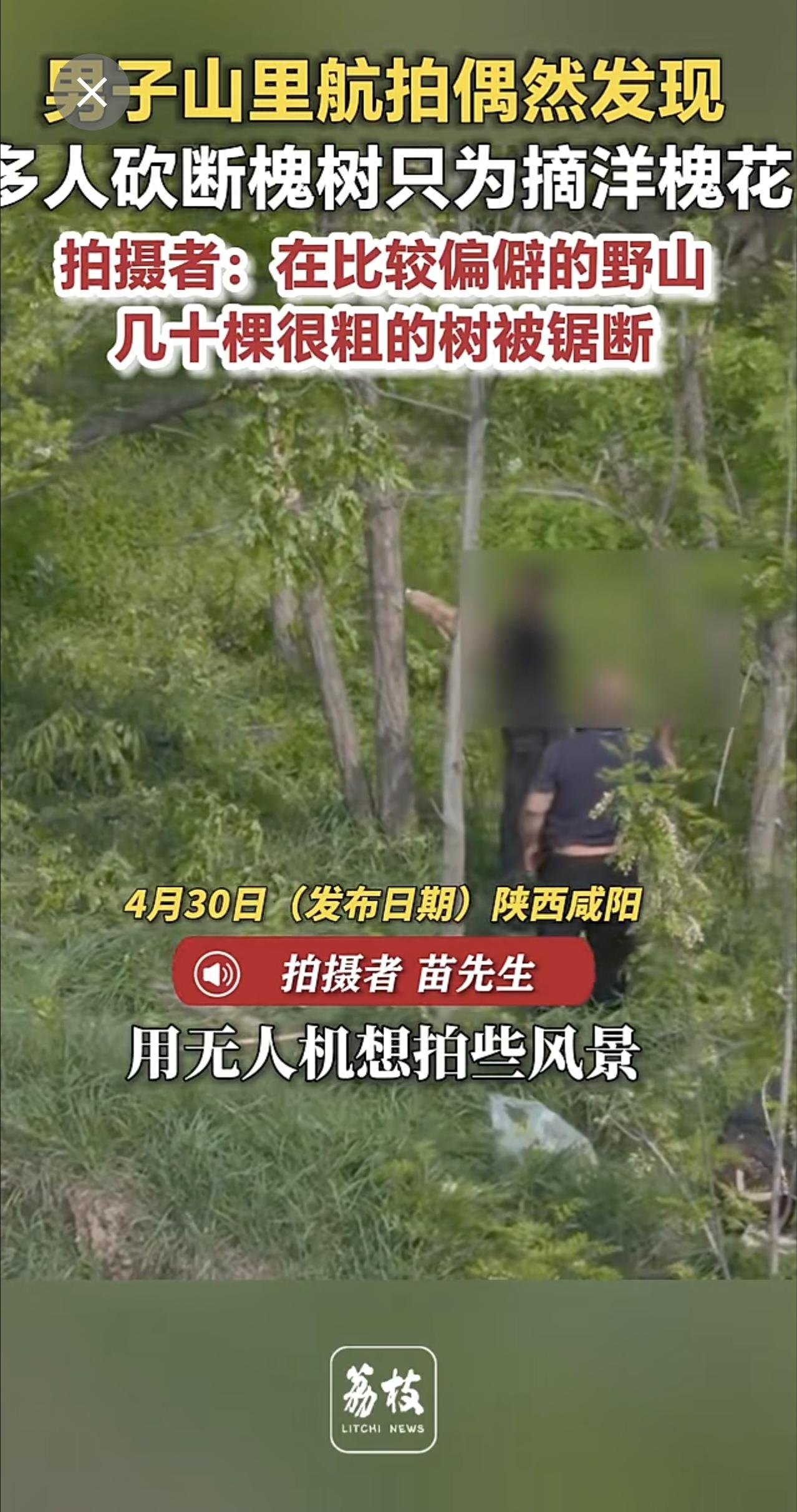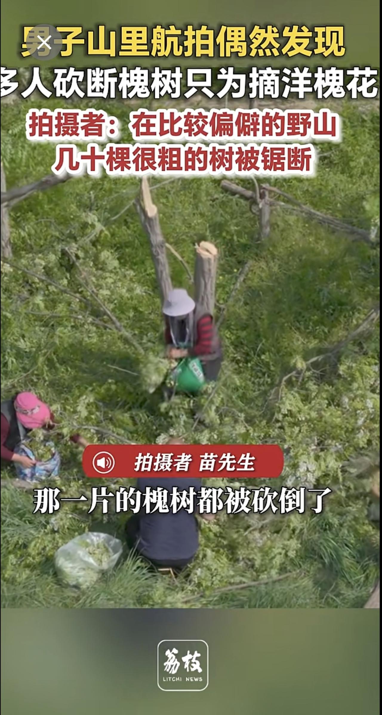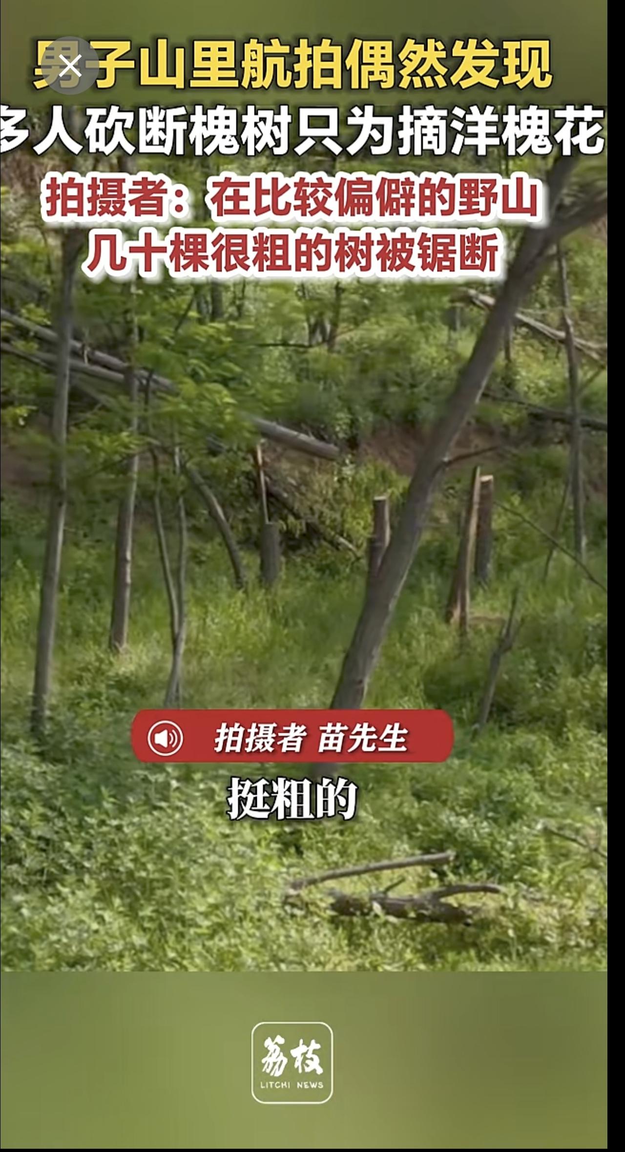 男子山里航拍偶然发现 多人砍断槐树只为摘洋槐花 拍摄者:在比较偏僻的野山 几十棵很粗的树被锯断保护自然