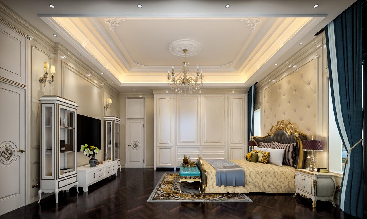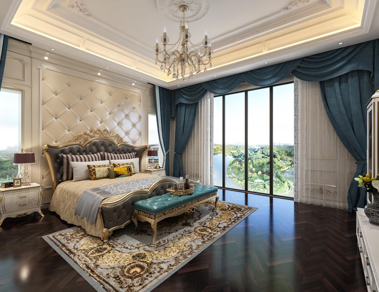 其次,头顶是双层的吊顶,中间是超大的水晶灯,这样的装饰一般常见于会客厅之中,应该是为了保持各房间的格调都一致,才会这样做吧。皮质大床床头还有软包的设计,松软的地毯,这种有质感的环境,会让屋主更快的入睡。