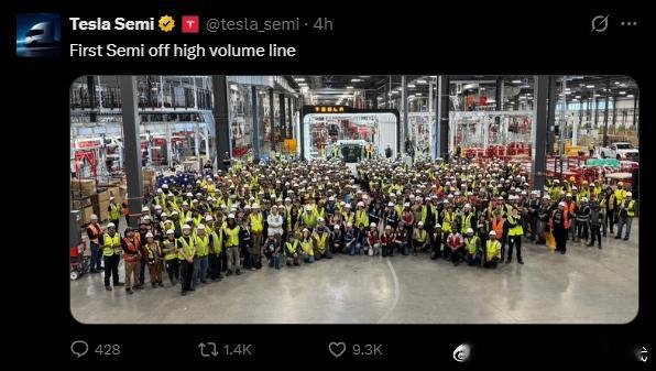 特斯拉Semi首辆量产车下线特斯拉Semi将大规模量产 今天特斯拉官宣首辆量产版 Semi 纯电重卡从内华达超级工厂专属高产能产线正式下线了!这可是 2017 年就亮相、原定 2019 年量产,硬生生鸽了 9 年的 "公路野兽" 啊!不是之前那种小批量手工组装,这次是正经的规模化量产线 ——170 万平方英尺专属工厂,年产能直接干到 5 万辆!关键是终于解决了电池瓶颈,4680 电池就在厂区内生产,不用再跟乘用车抢产能了,这波垂直整合太顶了!说点干货:800kW 三电机系统(1072 马力),满载 37 吨照样灵活起步;1.2 兆瓦 Megacharger 超充,30 分钟补能 60%,刚好卡货运司机法定休息时间,这细节绝了!标准版 325 英里续航 26 万美元,长续航版 500 英里 29 万美元,百事、沃尔玛这些巨头早就排着队了~这事儿对物流行业真的是地震级的!电动重卡规模化后,长途货运的碳排和成本都得降一大截。想象下未来高速上跑的都是这玩意儿,是不是还挺酷的?👉 你们觉得这会让传统重卡厂商慌吗?国内比亚迪、宁德时代这些玩家会不会加速跟进?评论区聊聊你的看法!