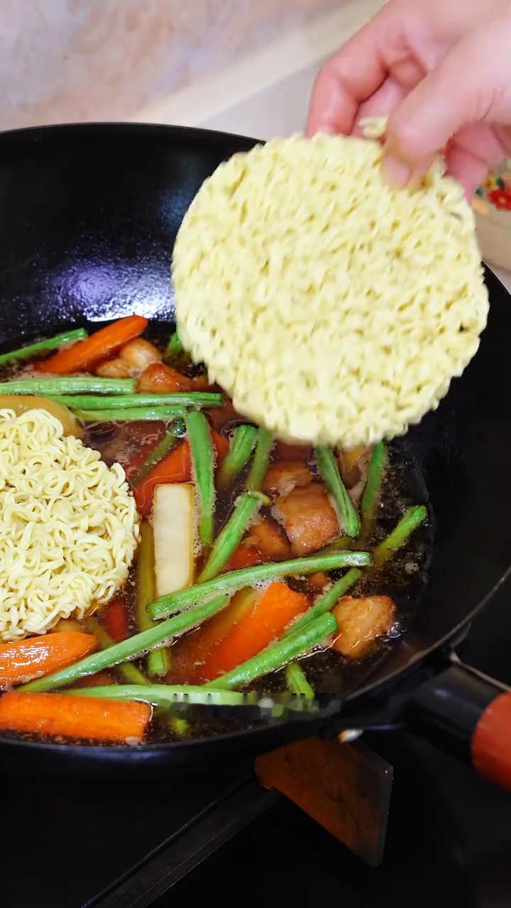 ·翻炒一下,然后再补一小勺盐跟白糖,清水加到没过食材面。面饼用清水泡1分钟左右。这个面饼我家是吃了有几年了,重点是它没有加什么胶。