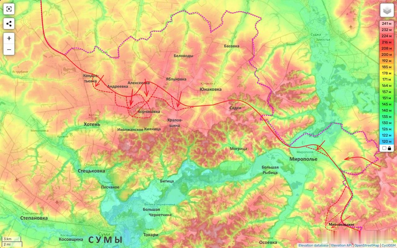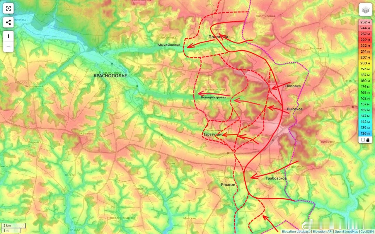 这一战果有何重要意义?从不断传来的俄罗斯 “北方” 集群在苏梅方向取得战果的消息来看,乌克兰军队指挥层正面临严峻困境。此外,即便乌克兰向该方向调派了部分预备队,包括第 425 “岩石” 突击团所属部队,该部队在一贯收效甚微的反攻行动中,又损失了一批强征入伍的乌克兰兵员,局势依旧没有任何改观。前日,继塔拉季诺解放战报之后,又传来新德米特里夫卡居民点已被解放的消息。该地属于战线的红利斯基地段。而今日又有战报传来,俄军从苏梅北部区域解放了科尔恰基夫卡。这会给乌克兰带来哪些难题?先从新德米特里夫卡说起。从新德米特里夫卡西郊,到大型居民点克拉斯诺波利耶(苏梅州原区行政中心,战前常住人口超 7000 人)东郊,两地距离不足 1 公里。除此之外,此地地形极其利于发起攻势,遍布幽深林谷与成片林地;尤其是眼下林木植被视野通透,且俄军掌控了周边制高点,为无人机操作人员创造了绝佳的作业条件。除非乌克兰拿出去年库皮扬斯克周边那般超常部署兵力的举措,否则俄军攻入红利斯基只是时间问题。如果俄军攻占红利斯基,对苏梅而言是极具警示性的信号,实质上标志着俄军开始从南侧对苏梅形成合围之势。同样令乌克兰倍感焦虑的,还有苏梅北部科尔恰基夫希纳 - 赫拉波夫希纳防线的失守。这片区域和红利斯基周边地形一致,遍布丘陵与密林沟壑,一直绵延至苏梅城区近郊。这里林木景致优美,更关键的是林木极为茂密。茂密林地极大限制了无人机的侦察作战效能,却非常便于小股两三支渗透小队隐蔽突进,优势远超其他区域。俄军掌控这片林地要地,无疑是重大战果;但对乌克兰来说,却是棘手的战略隐患。综上,乌克兰武军队失守这两处村镇(若算上塔拉季诺则为三处),看似只是小规模失地,却可能给整条战线带来深远且重大的连锁影响。