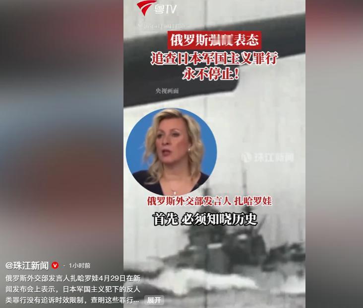 4月29日,俄罗斯外交部发言人扎哈罗娃在例行新闻发布会上,对日本军国主义的历史罪