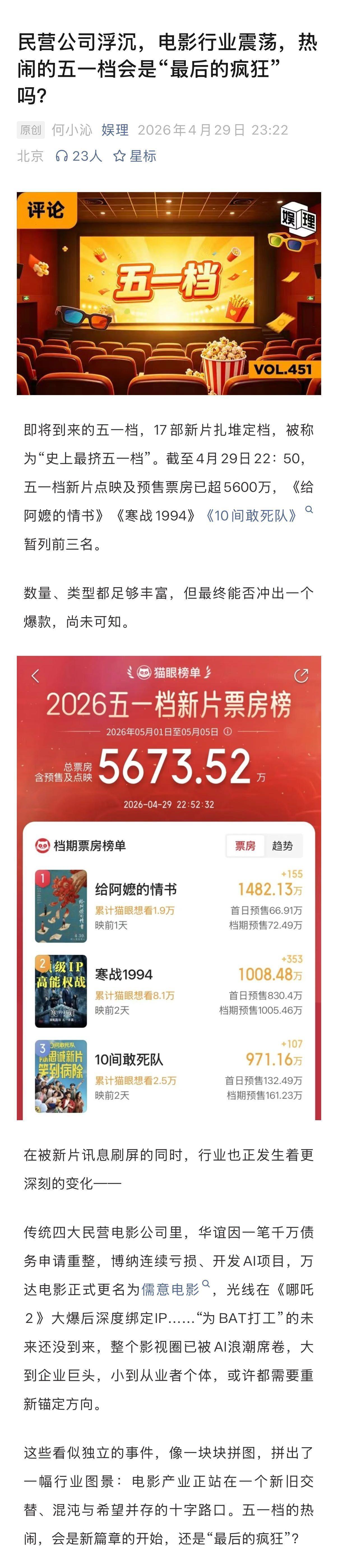 史上最挤五一档17部新片扎堆陈思诚五一档独扛投资风险 有资方觉得蒋龙、张弛还没到能“扛票房”的时候,但陈思诚不这么认为。《10间敢死队》是他作品序列里出品方最少的一部,独立押注,也独立承担结果。他把大部分投资风险自己扛了下来,因为他相信市场需要新鲜血液。