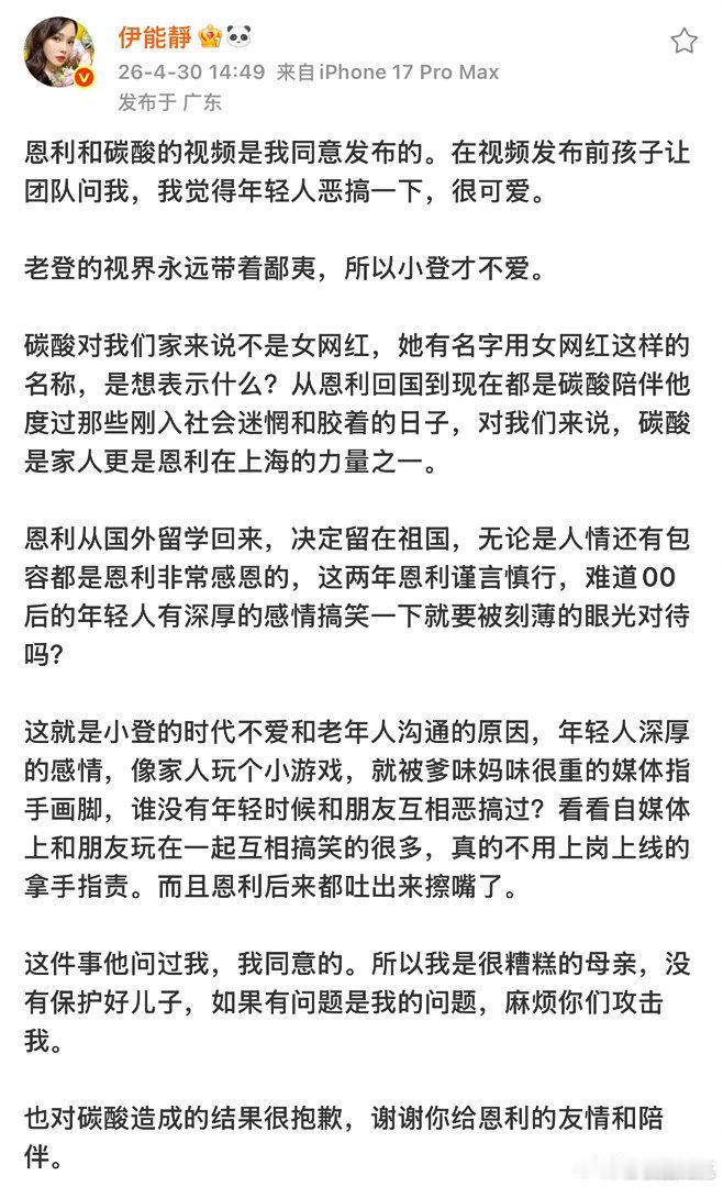 伊能静替恩利回应翻车伊能静替恩利回应争议翻车 伊能静替恩利回应争议翻车,现在恩利被骂妈宝男了 伊能静回应恩利争议视频