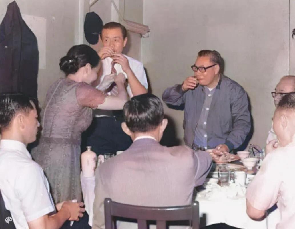 这是蒋经国与人聚餐时举杯畅饮时的一幕,受早年在苏联的经历影响,他和老婆蒋方良都喜欢饮酒,在苏联时喜欢烈酒伏特加,后来回国之后,也会经常小酌,一般的黄酒更是千杯不醉,有时候请人吃饭,都用大脸盆来装黄酒,一边喝还一边划拳,气氛十分热烈。