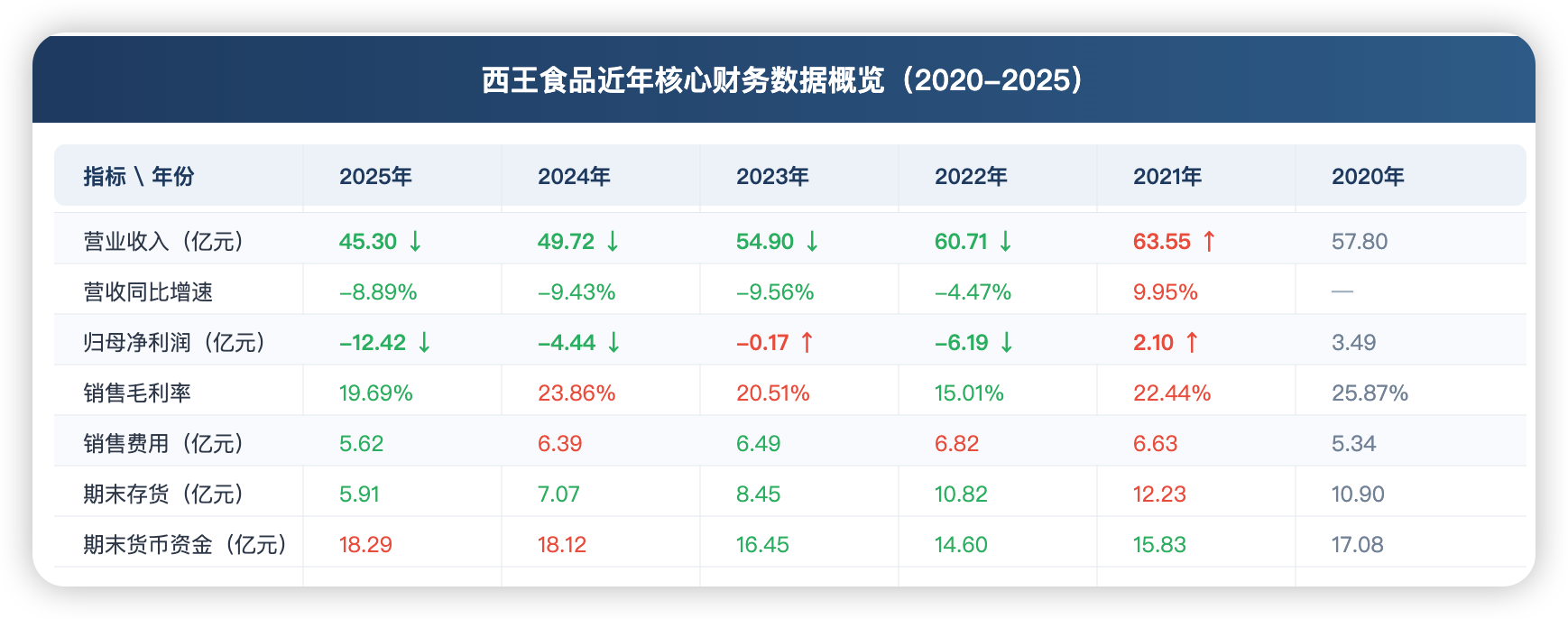 利润端的波动更为剧烈。2020年,西王食品归母净利润仍有3.13亿元;2021年降至1.84亿元;2022年转为亏损6.19亿元;2023年亏损收窄至1686.58万元;但2024年再度亏损4.44亿元,2025年亏损进一步扩大至12.42亿元。