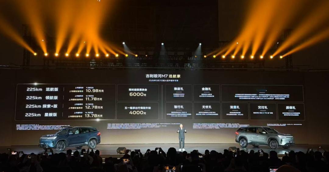 吉利银河M7远航家正式上市,限时10.98万元起,定位紧凑型插混SUV,纯电续航225km,综合续航1730km,采用“星汉涟漪”灯组、AGS智能可变进气格栅及Flyme Auto 2智能座舱,尺寸比银河L7、星舰7更大,将与比亚迪宋Pro DM-i、长安启源Q07等竞品展开竞争。吉利银河M7上市