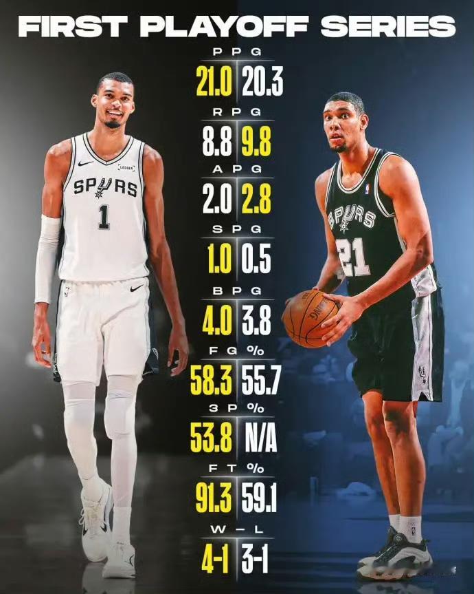 文班亚马与邓肯生涯首次季后赛系列赛数据对比: 得分方面,文班21.0分,高于邓肯
