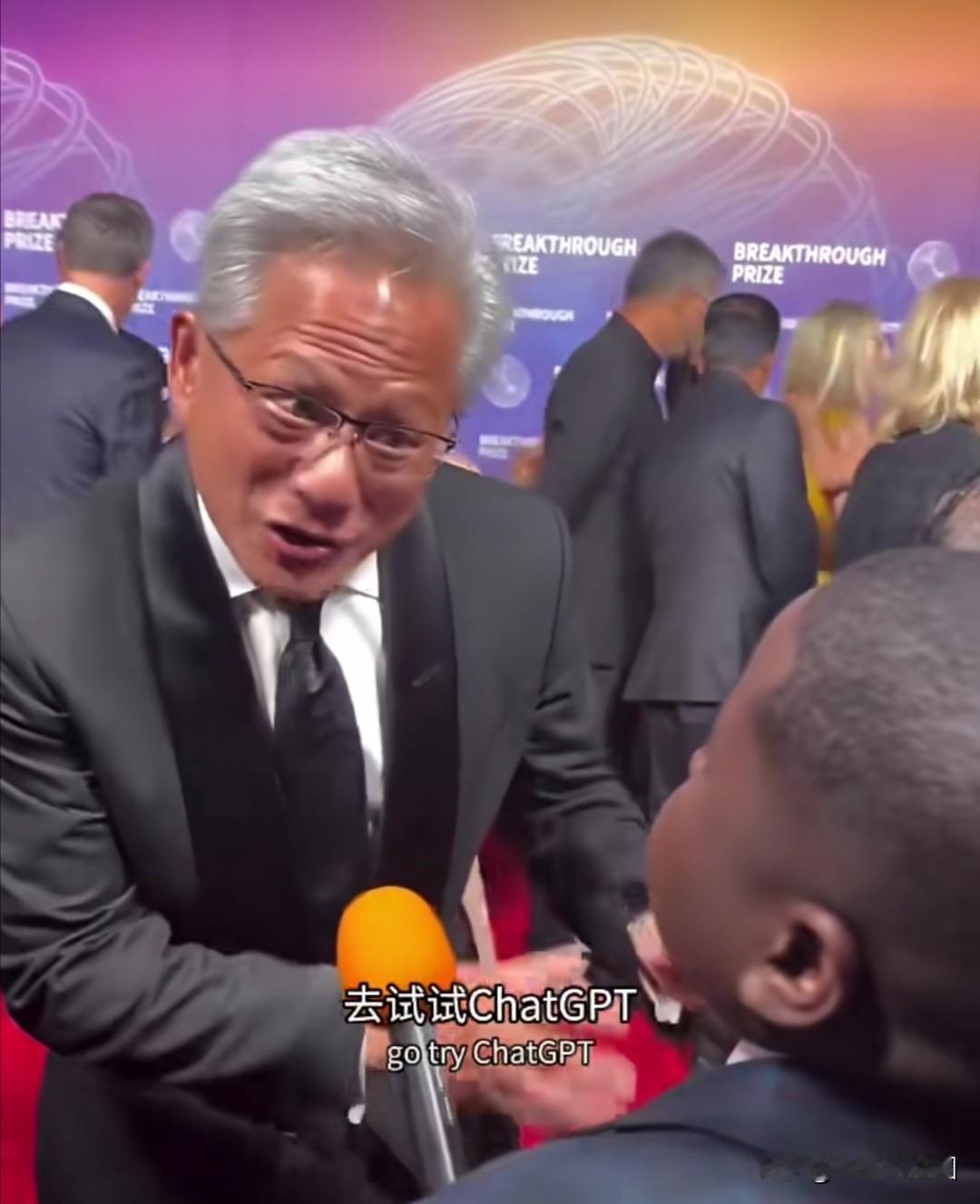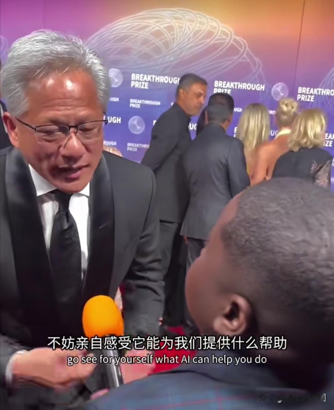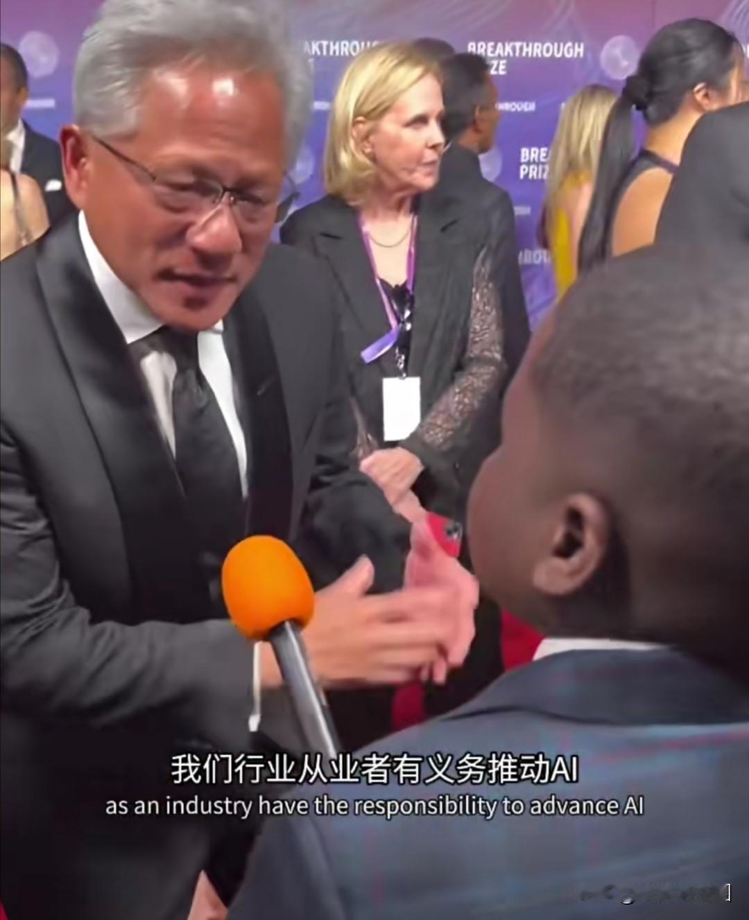 在整个交流过程中,黄仁勋始终保持身体前倾、视线平齐的姿态,未使用讲台或麦克风架,以肢体语言体现对提问小孩的尊重。