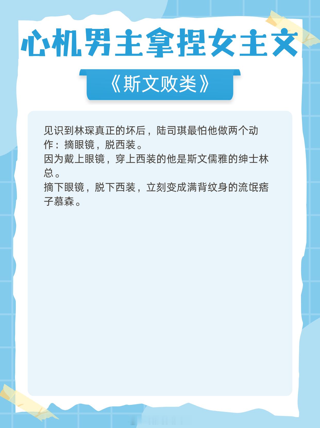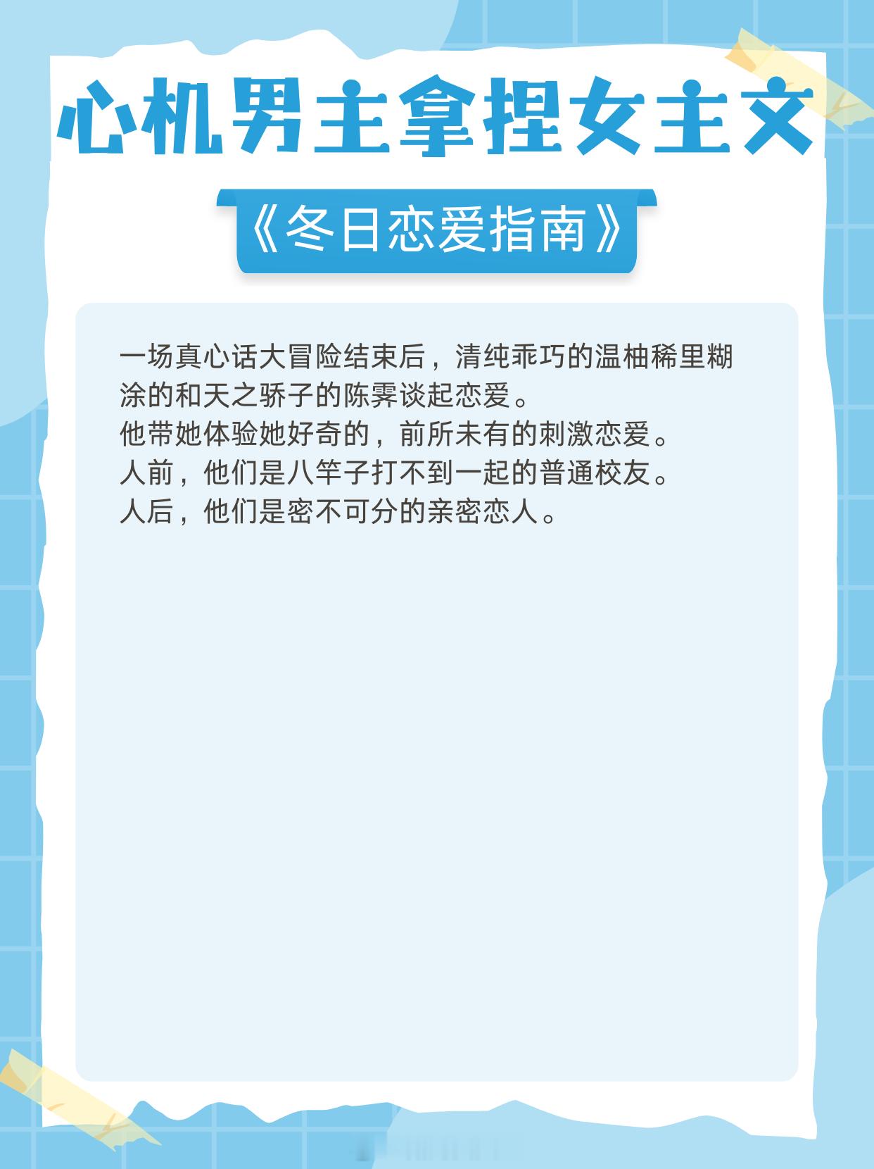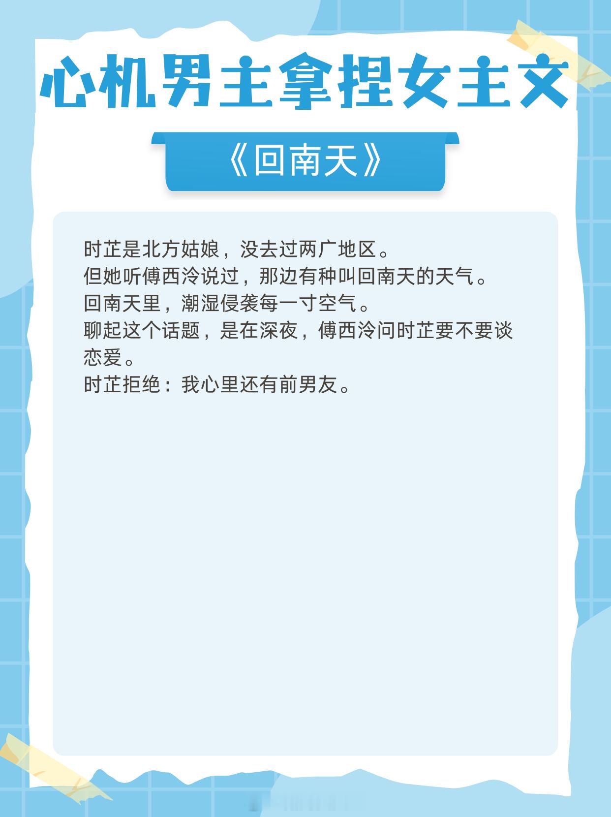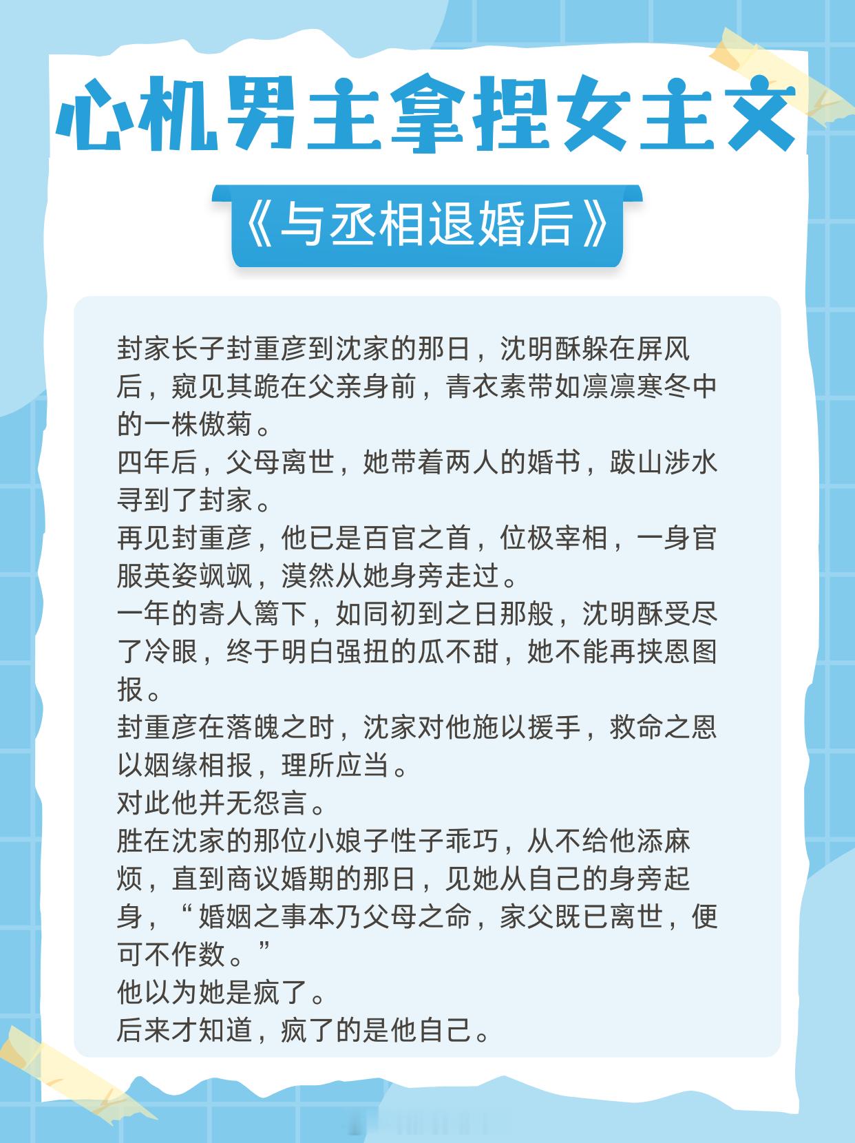 心机男主拿捏女主文,多年暗恋,步步为营,抱得美人归!1.《香波之外》作者:核萄2.《八分像》作者:偷马头啊3.《与丞相退婚后》 作者:起跃4.《回南天》 作者:殊娓5.《斯文败类》 作者:臣言6.《伺机而动》 作者:姜之鱼7.《冬日恋爱指南》作者:时星草8.《她的港》作者:安迟声9.《请你坐在月明里》作者:勖力那些高开炸走的小说 老牌小说作者的含金量谁懂