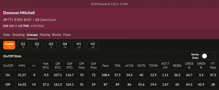 据统计,米切尔今天在场时,骑士净效率-9.5;而当米切尔不在场时,骑士净效率高达+37.2。