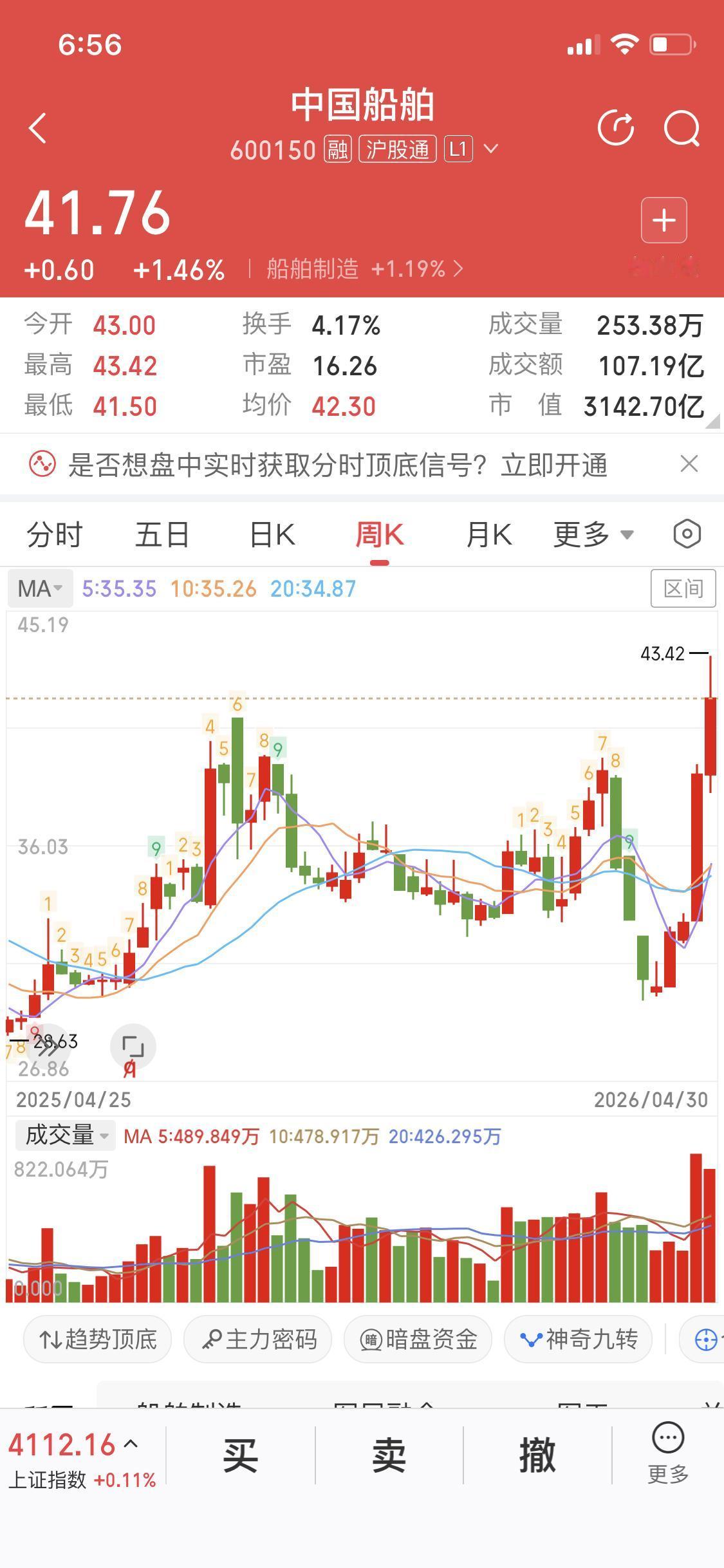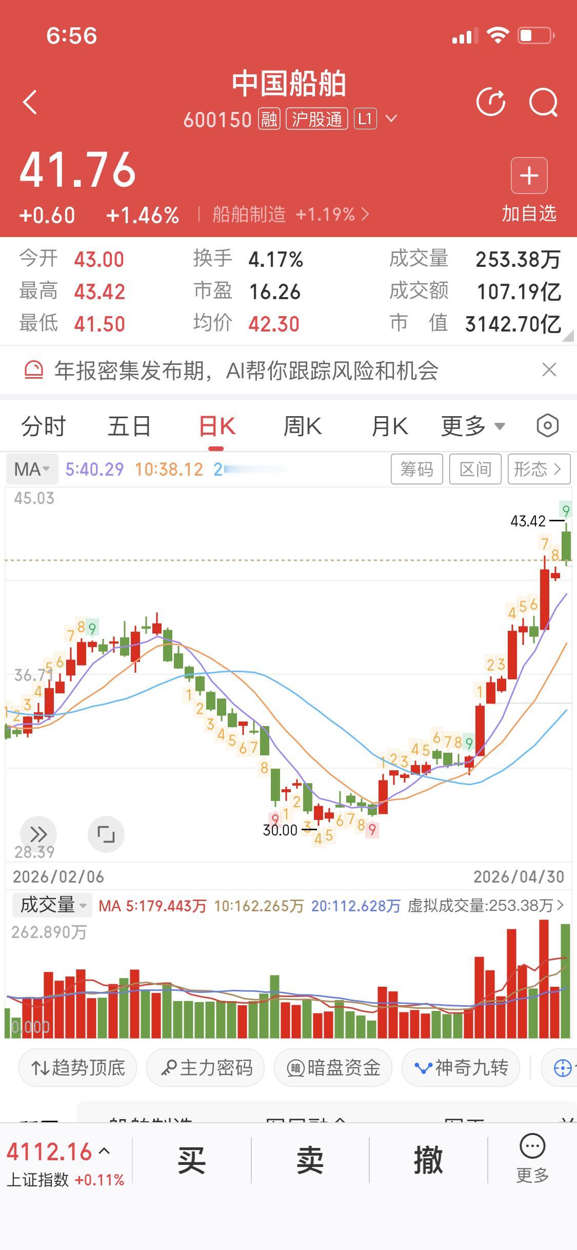 从日线看,中国船舶已经把前期高点39.46打掉了