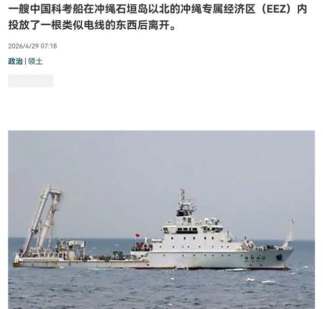 轮到日本跳脚抗议了!4月29日,日本产经新闻报道称,29日凌晨12点20分左右,一艘据信在冲绳县石垣岛以北“专属经济区”进行海洋研究的中国船只驶离了该区域。日本海上保安厅第11地方本部(那霸)证实并公布了此事。该事件发生在4月15日,当时一艘日本巡逻船发现一艘中国船只向海中伸出一根类似电线的物体,并要求其停止活动。