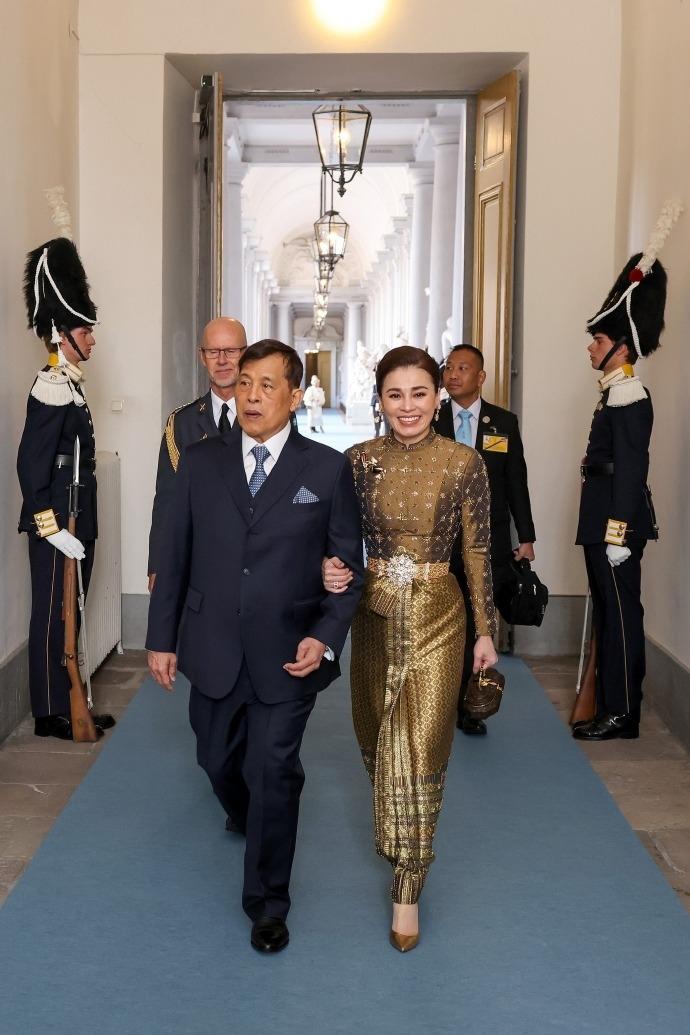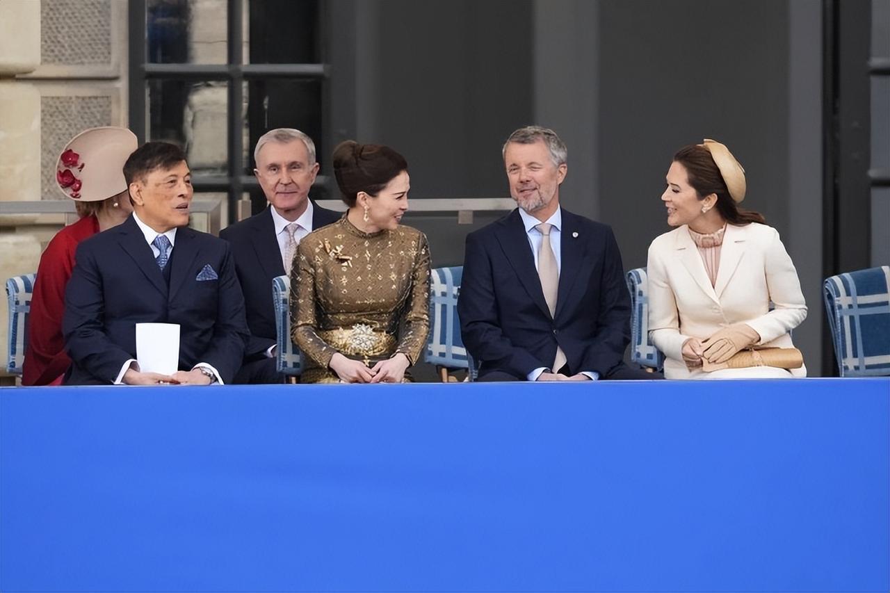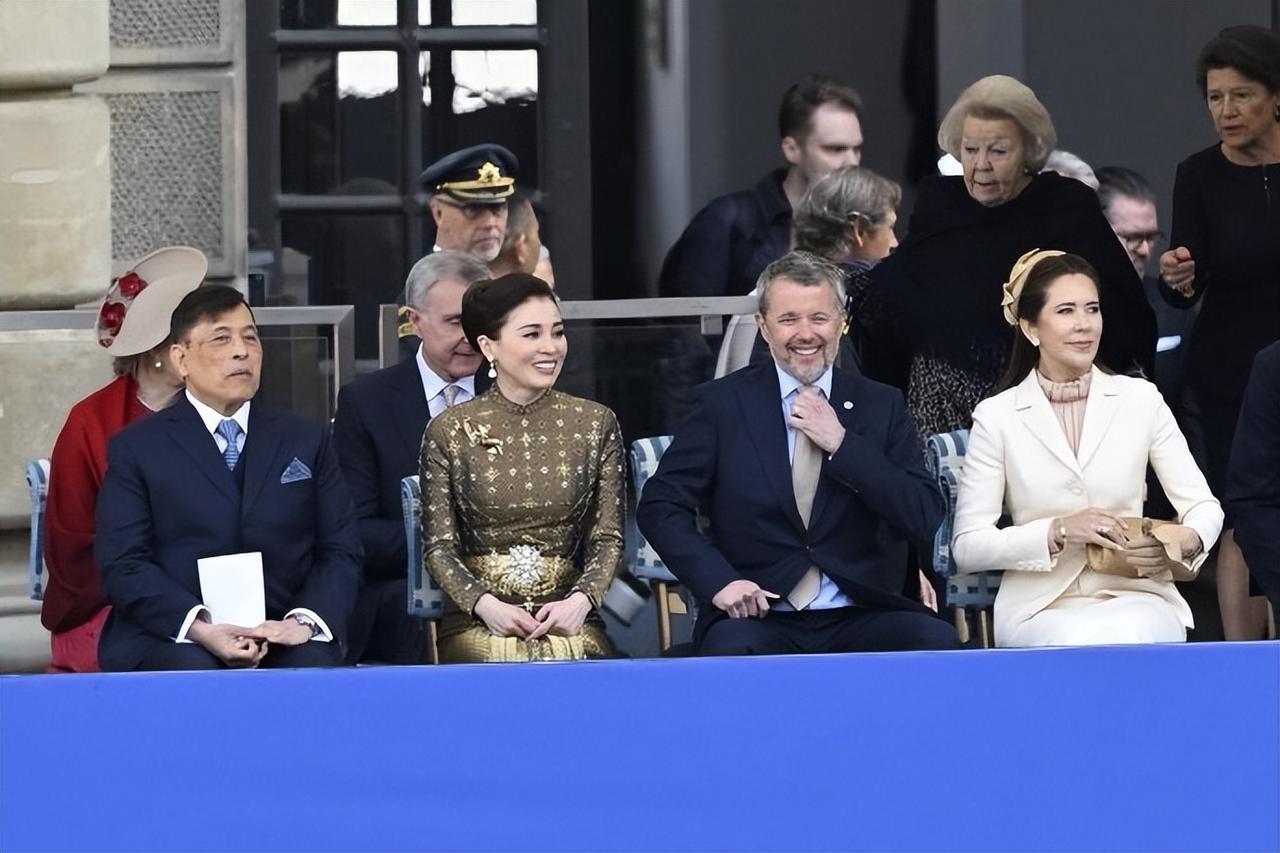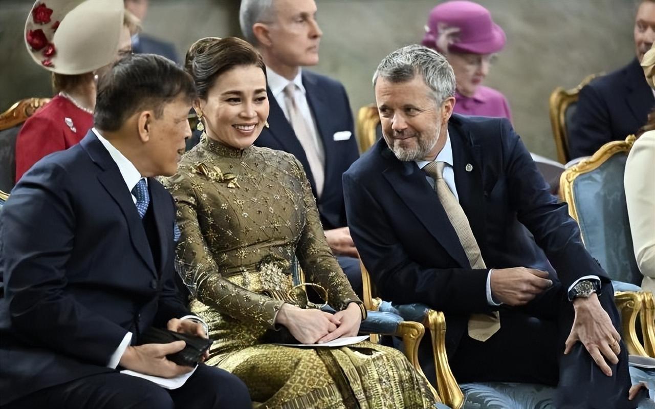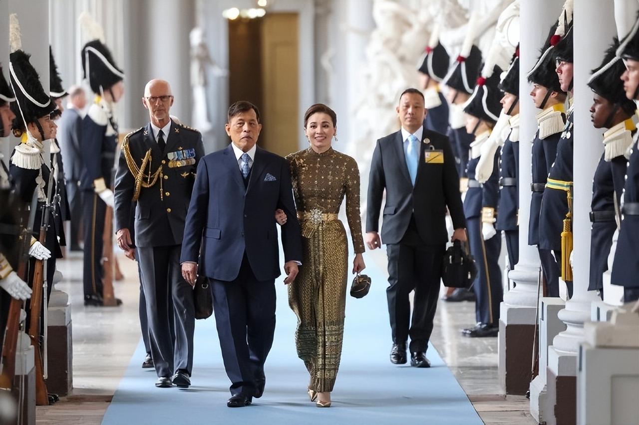这套专为高规格国事场合打造的王室礼服,既是对东道主的尊重,也是泰国文化自信的高调表达。在欧洲王宫的西式背景里,自带强烈文化辨识度的泰服,可以说这套衣服一眼就能抓住所有人的目光,妥妥的 “穿出国门的东方美学”。就连苏提达身边的丹麦国王期间还不停用眼神多看她几眼。眼神满是欣赏和佩服。