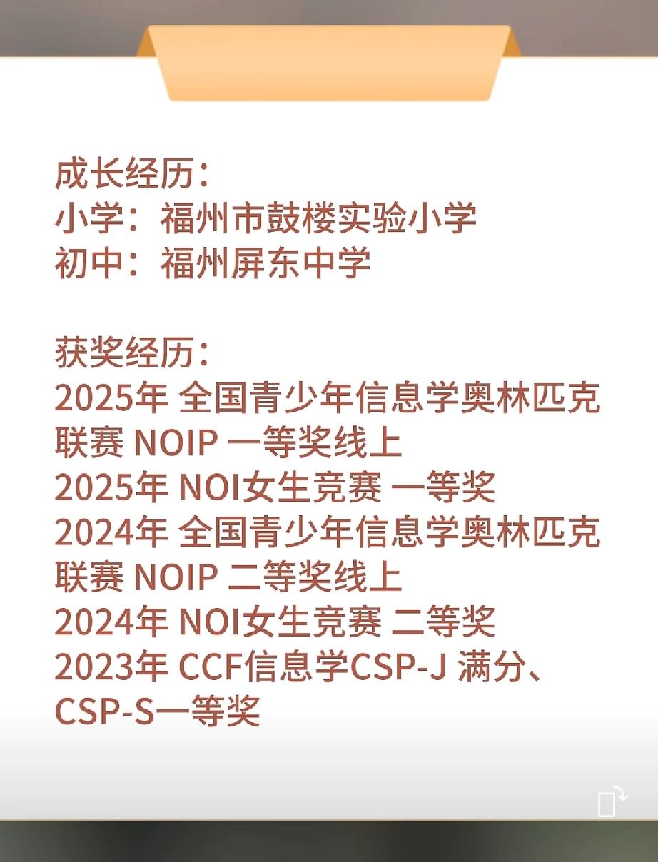 喜报!特大喜讯!福州屏东中学初三女生提前“锁定”中科大少年班!天才少女,初代学神!这位小学出自鼓楼区实验小学的,屏东中学初三年段女生蔡昀熹以超线47分,这是多么强大的初三毕业生?一举拿下中国科技大学少年班A档资格,这当然也是2026年福建全省唯一一个该少年班的上线入围考生同学。少年强则国强,少年智则国智,为屏东中学培养出来如此优秀的祖国人才大大点赞![强]这个中考前的喜报多么鼓舞人心?成绩刚刚公布,这位仅仅只是初三毕业生竟然榜上有名。据了解,蔡同学已经在福州一中学习高中课程三年啦,同时在福州高中最高学府...福州一中数学竞赛组和信息竞赛组双修,蔡同学太威武啦![强]这是一个天才少女,丫霸!非常优秀的孩子,当然也要表扬一下默默辛苦付出的老师和家长。福州初中升学率 福建文科类榜眼 福建最牛高中 屏东学校 实时更新福州教育讯息,收藏并关注