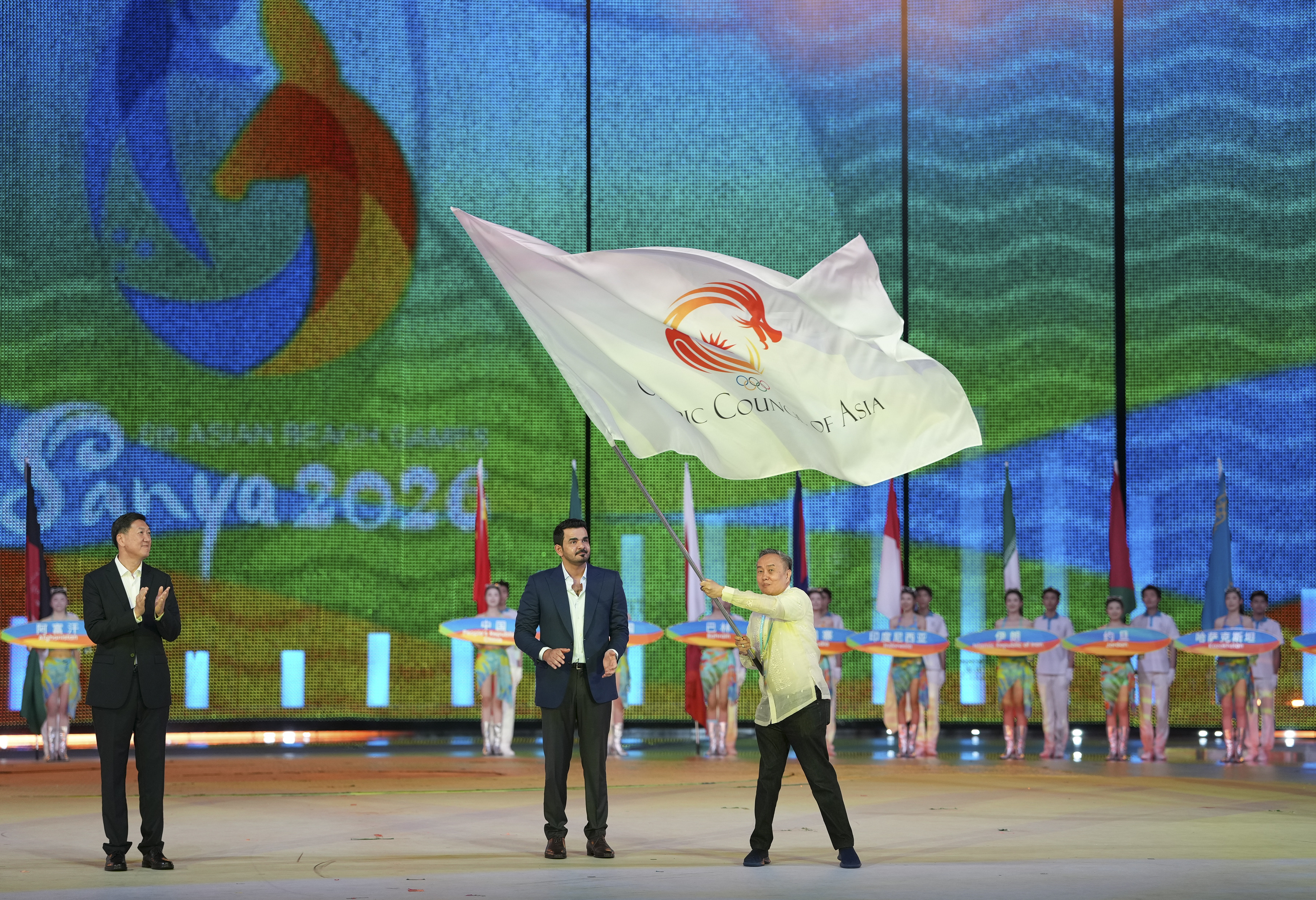 4月30日,菲律宾奥委会主席亚伯拉罕·托伦蒂诺(右)挥动亚奥理事会会旗。