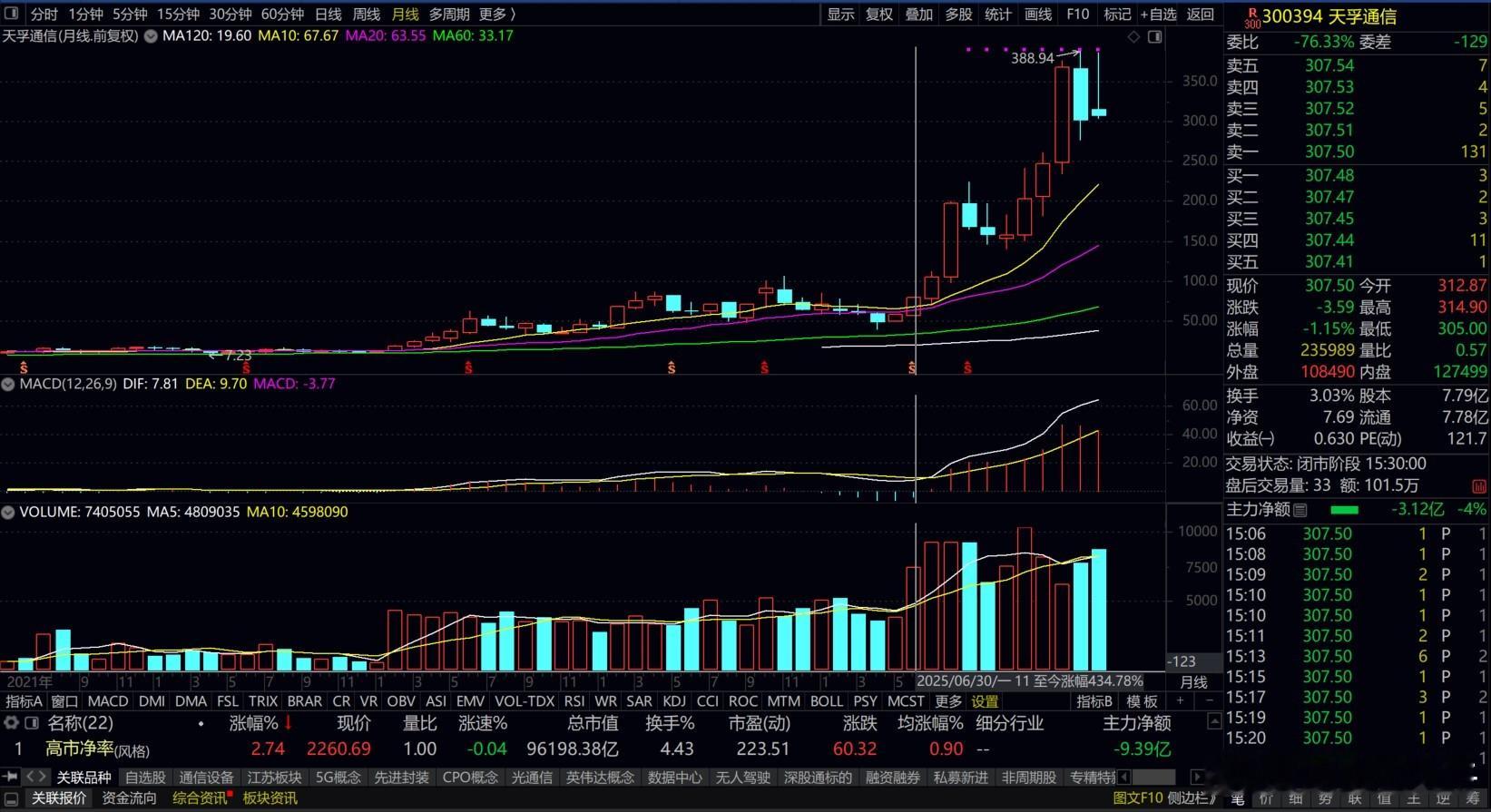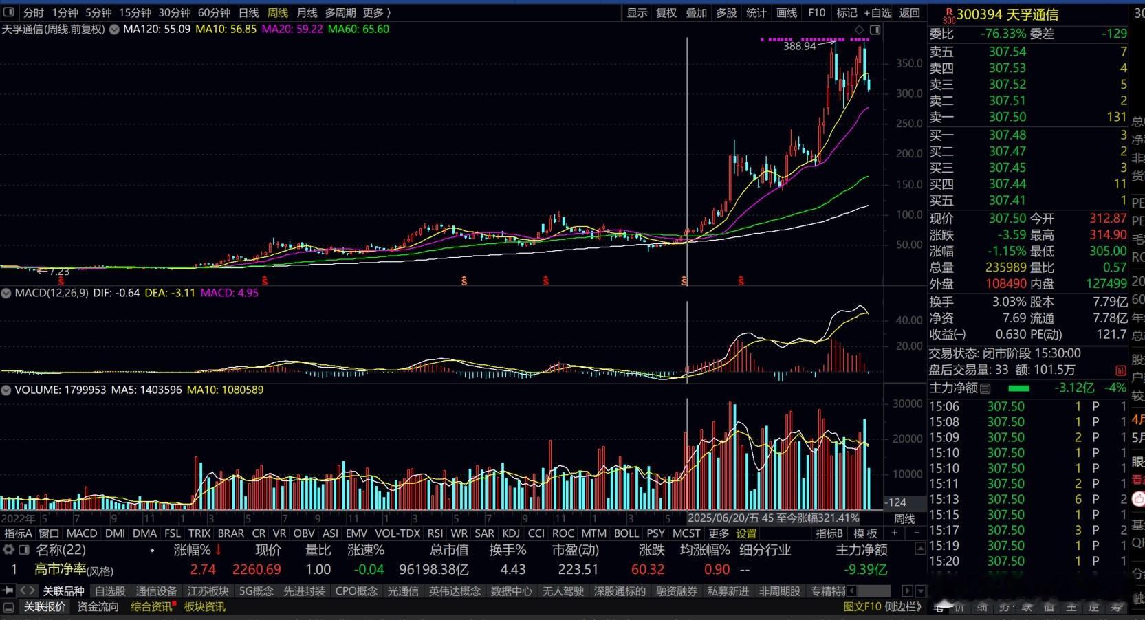 感觉天孚通信前一段时间的388.94是一个大级别的高点。也许就像是2015年5月接近500元的全通教育那样的大级别高点。此为一家之言,一家之见。