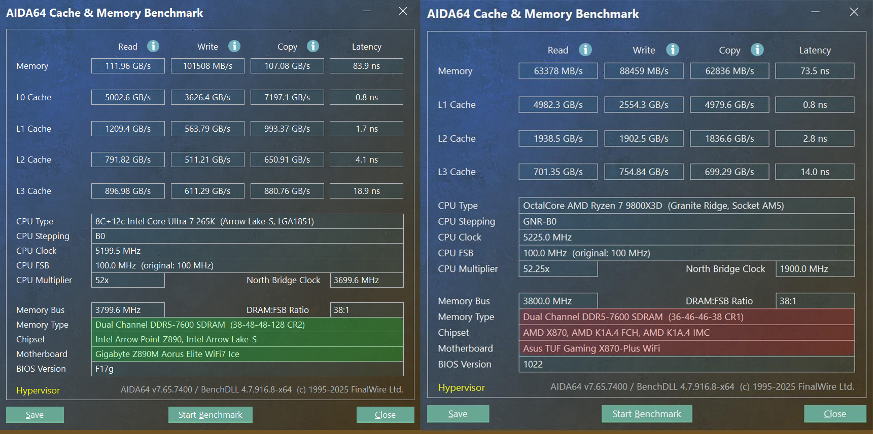 随后在两个平台手动超频都稳定至7600MHz,从下图中可以看出,AMD平台7600MHz的性能与6000MHz相差并不大,但在intel平台的性能提升非常明显:
