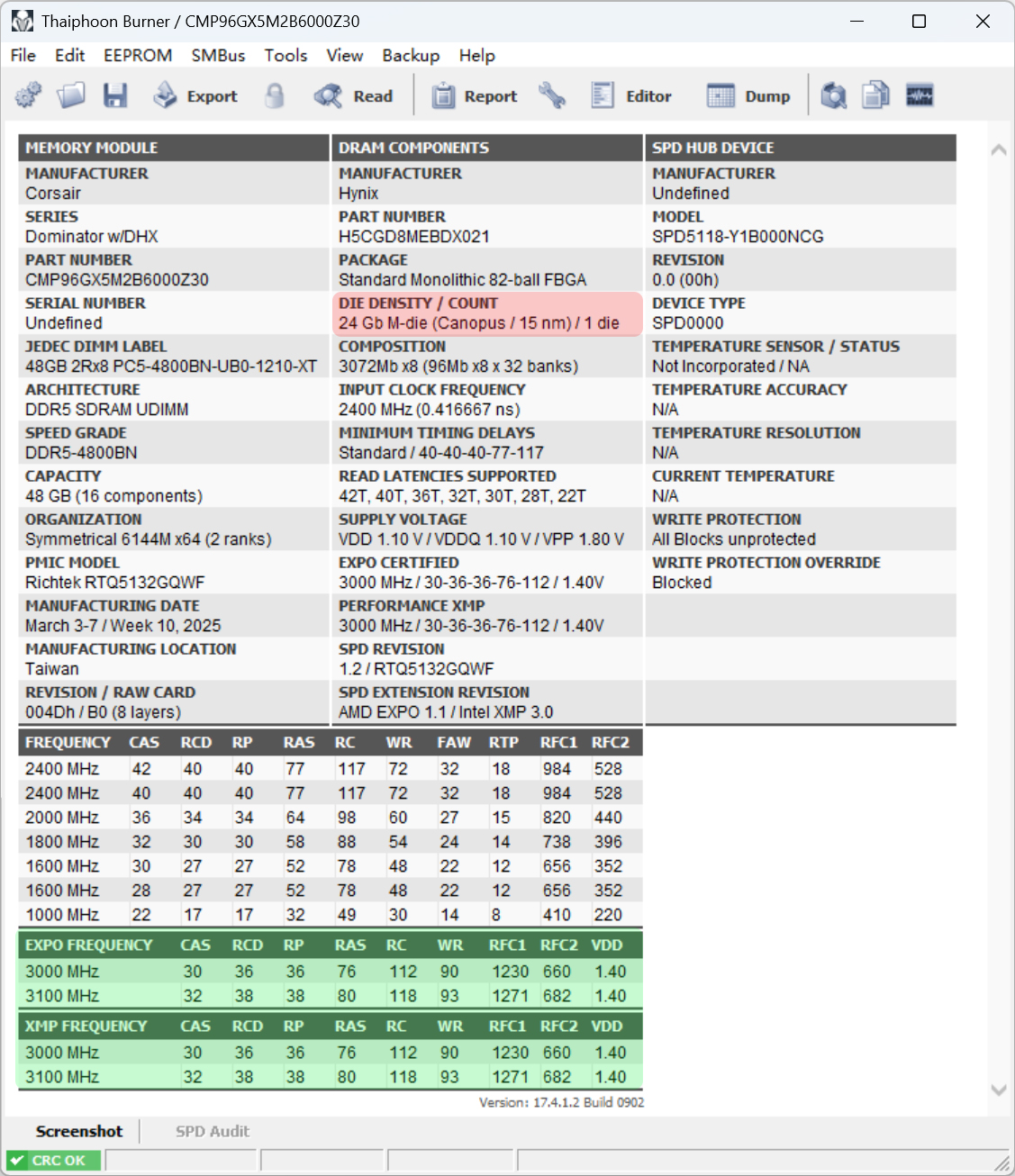 海盗船统治者泰坦96GB (48GBx2)采用海力士M-Die颗粒,默频4800MHz,时序40-40-40-77,支持intel XMP和AMD EXPO技术,可一键超频至6000/6200MHz(统治者泰坦预设了2个超频方案)。同时,配备定制高性能PCB板并板载电压电压调节功能,有助于保证信号的完整性和稳定性,减少高频信号传输中的干扰和衰减,这对DDR5高速内存来说至关重要。