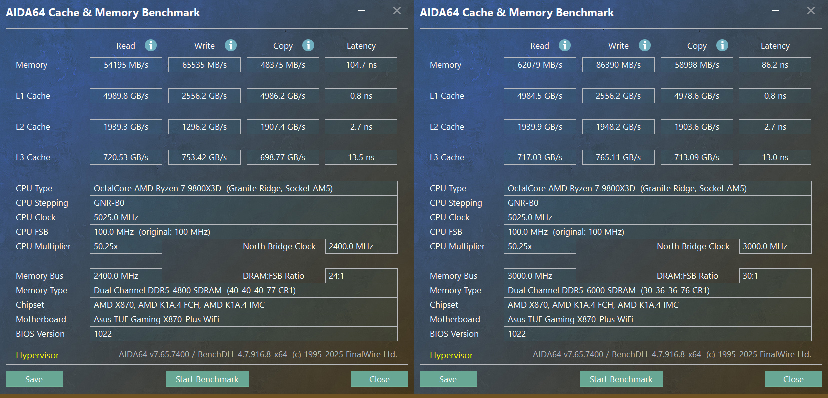在AMD 锐龙7 9800X3D+华硕 TUF X870PLUS WIFI平台上,统治者泰坦96GB (48GBx2)默认4800MHz频率,内存读写速度54195 MB/s和65535 MB/s,拷贝速度48375 MB/s,延迟104.7ns。开启EXPO一键超频至6000MHz,时序30-36-36-76,性能测试相比默认频率有大幅提升:
